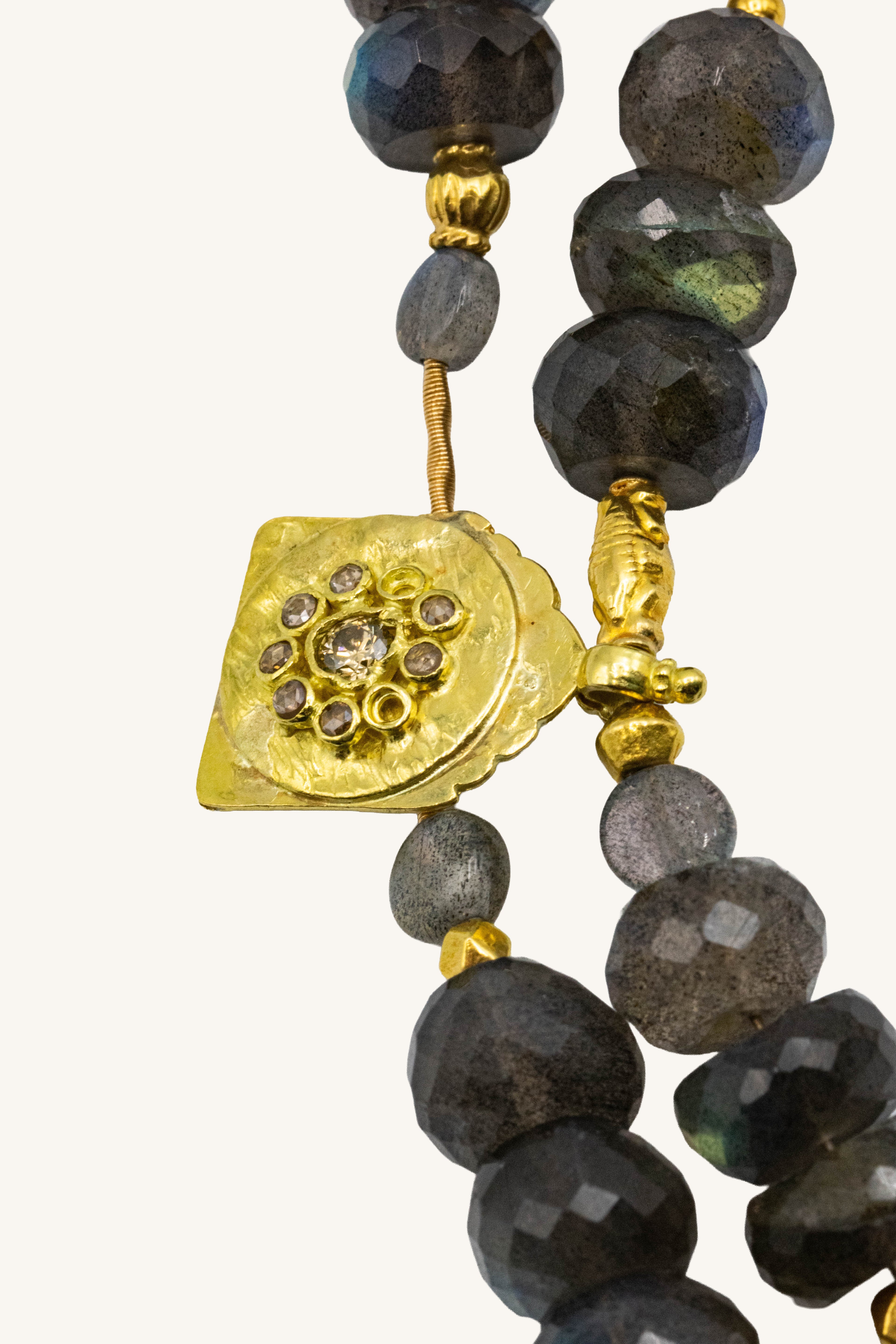 Long necklace of mixed labradorite with 18k & 14k yellow & white gold with diamond accents. Can be worn as a long strand, doubled as a shorter necklace, or wrapped around the wrist as the ultimate bracelet. Fantastic travel item.