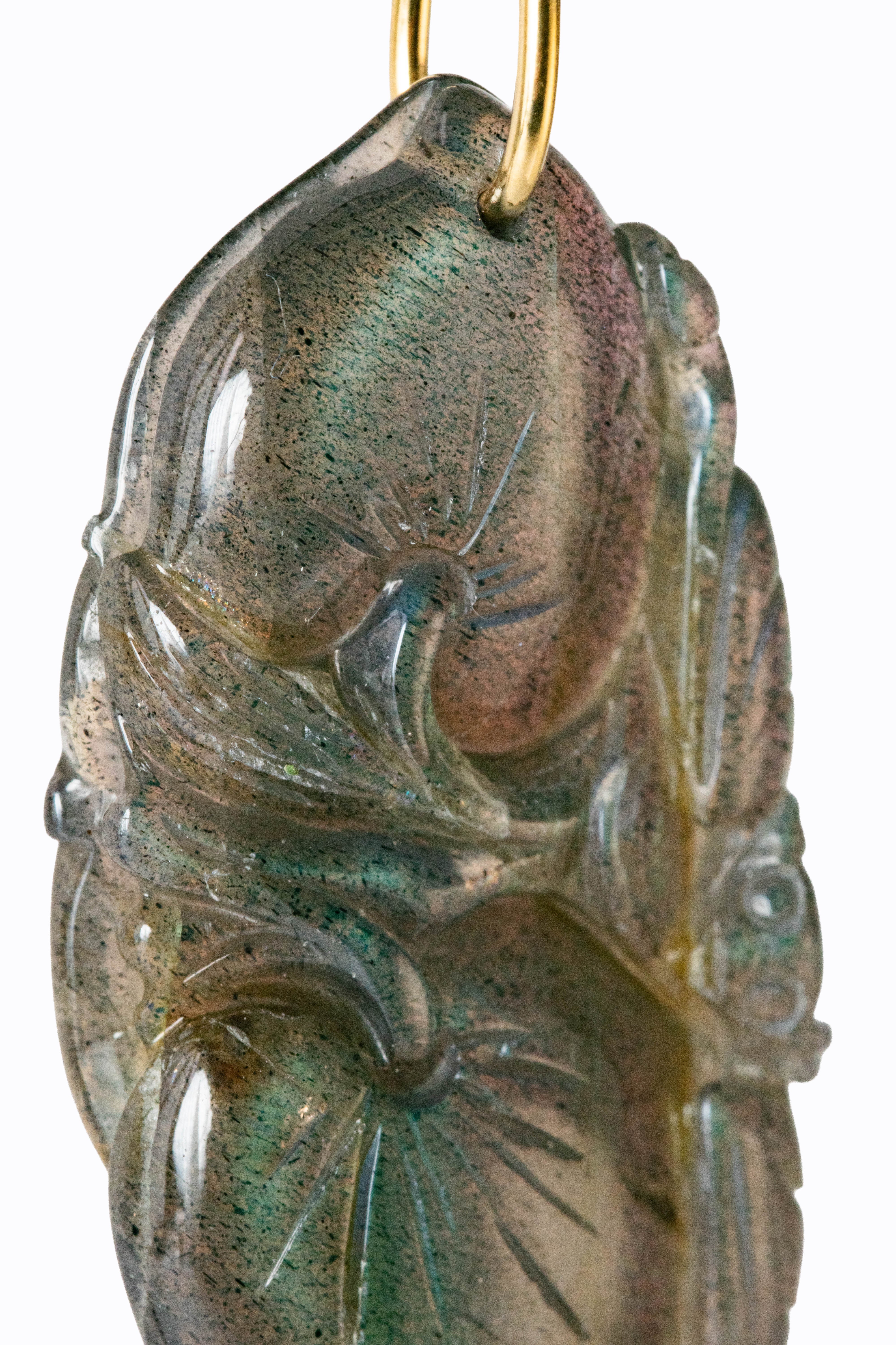 Labradorite carved pendant in 18k yellow gold, beautifully cut to show the colors of the stone.