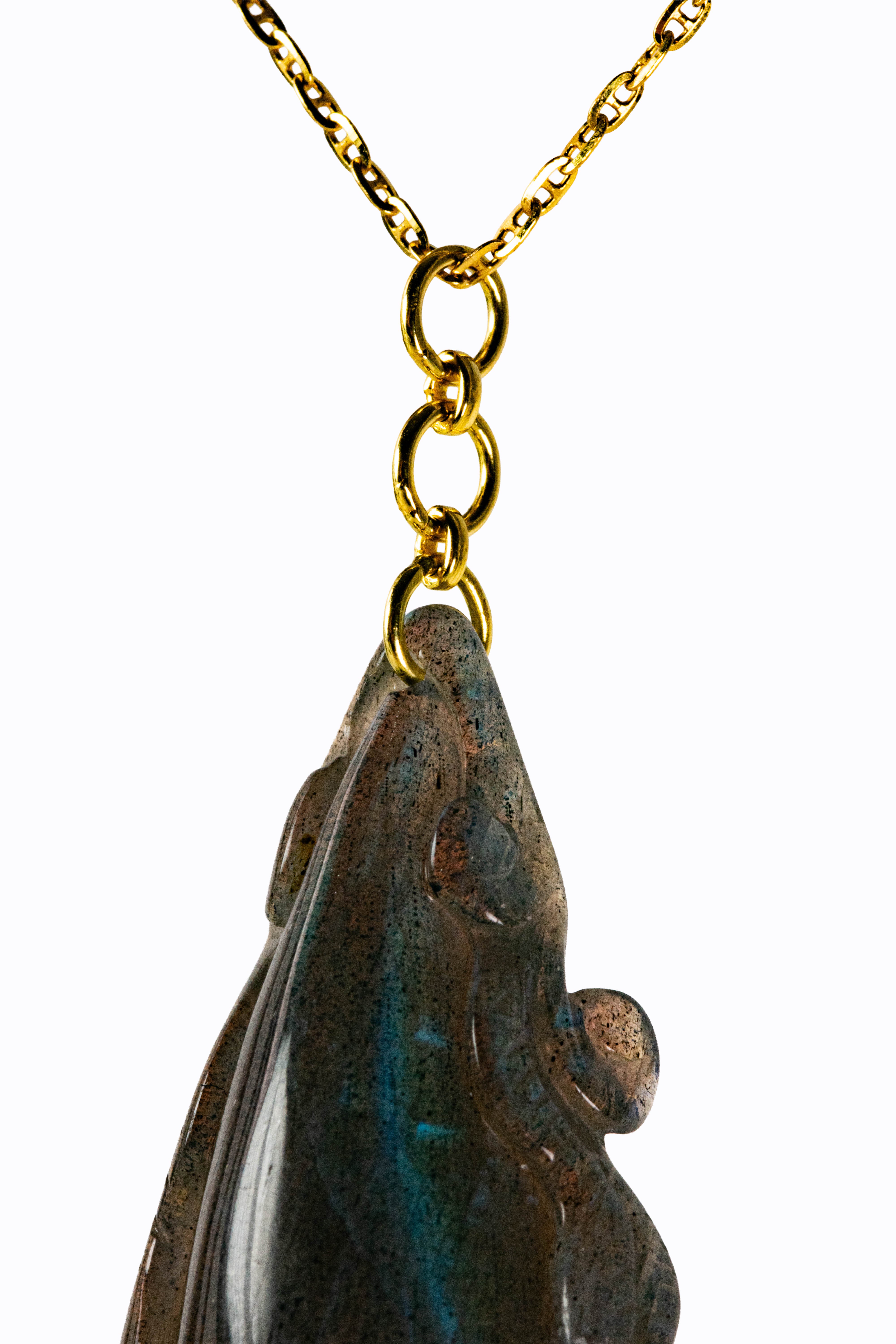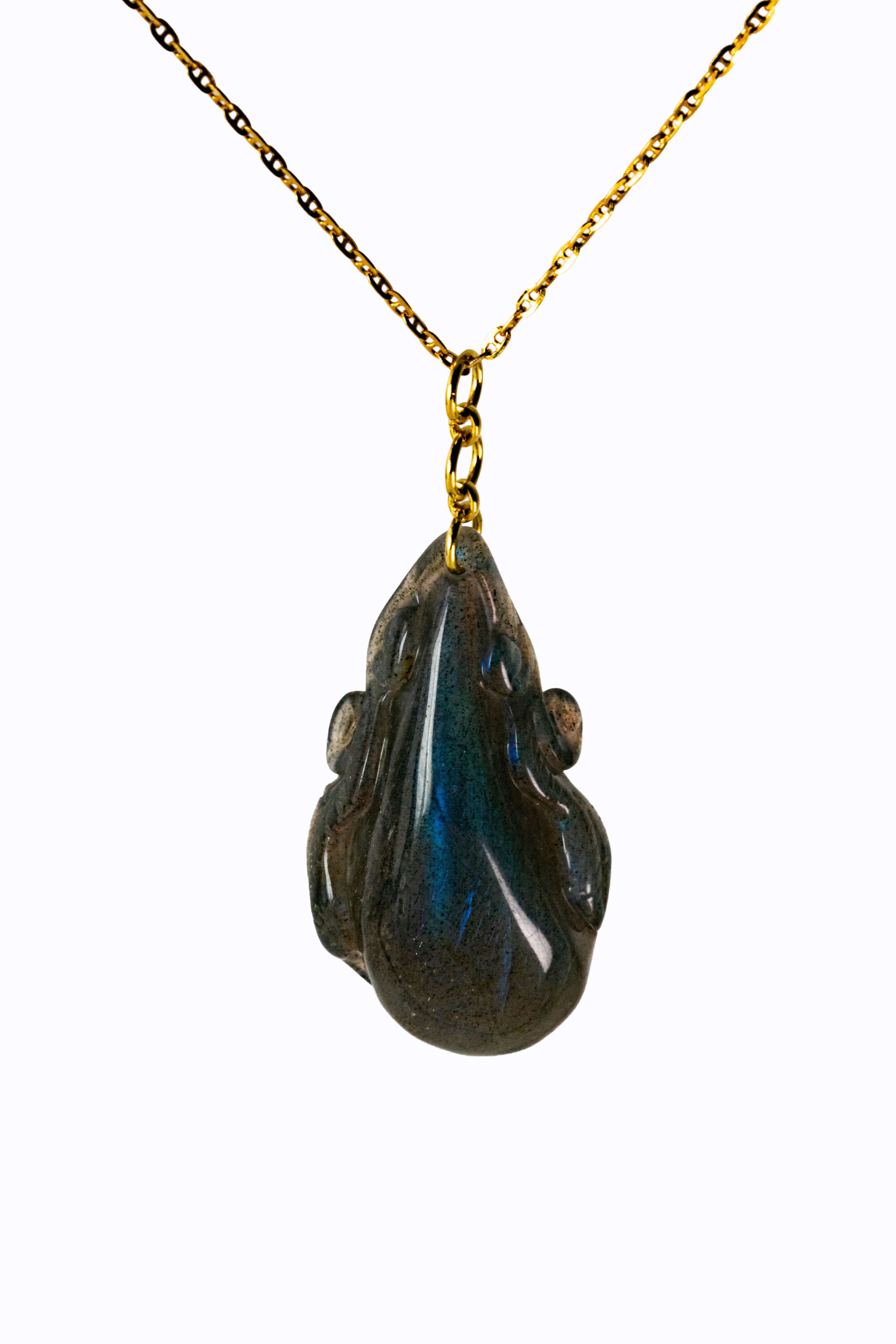 Labradorite carved pendant in 18k yellow gold, with a deep blue color.