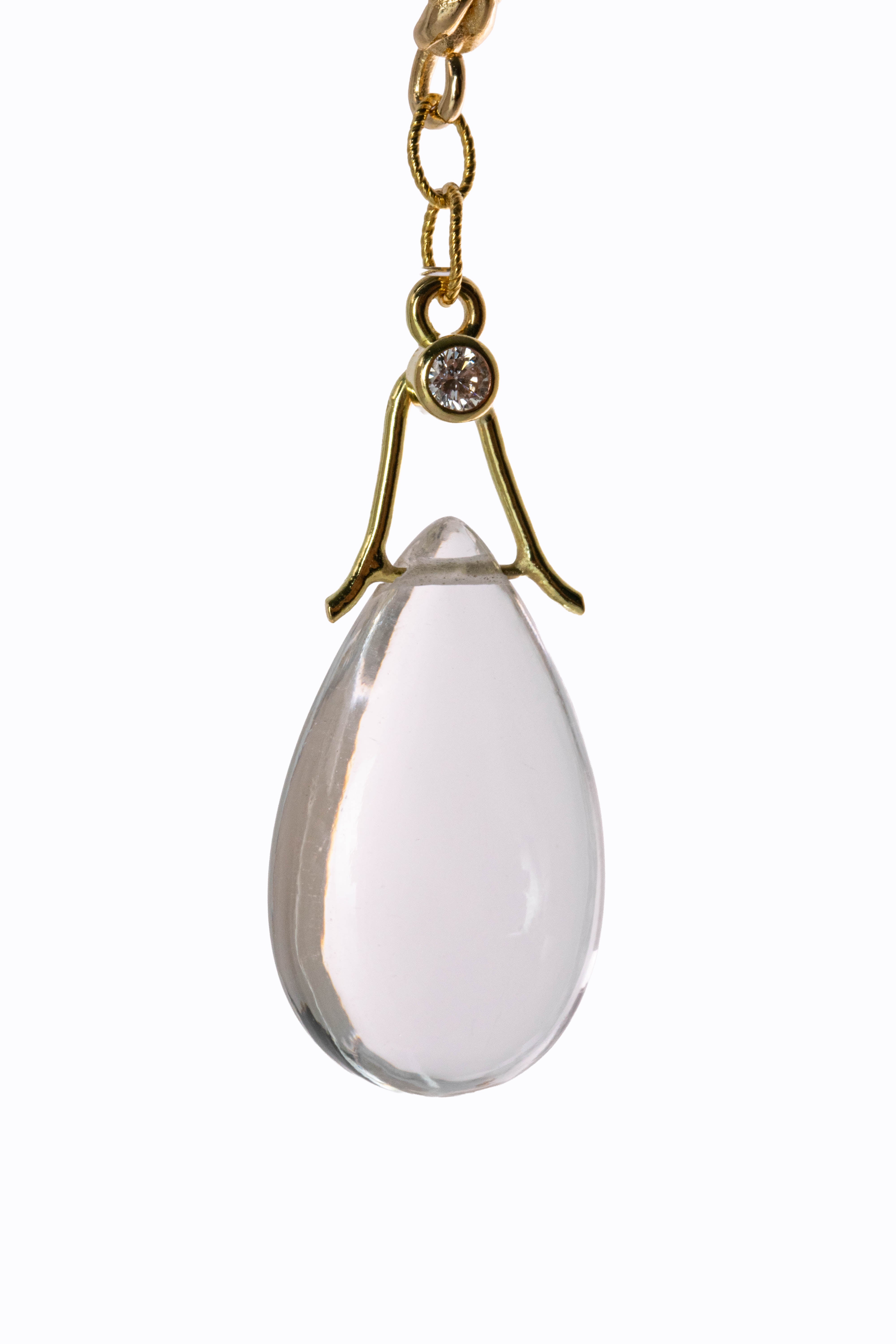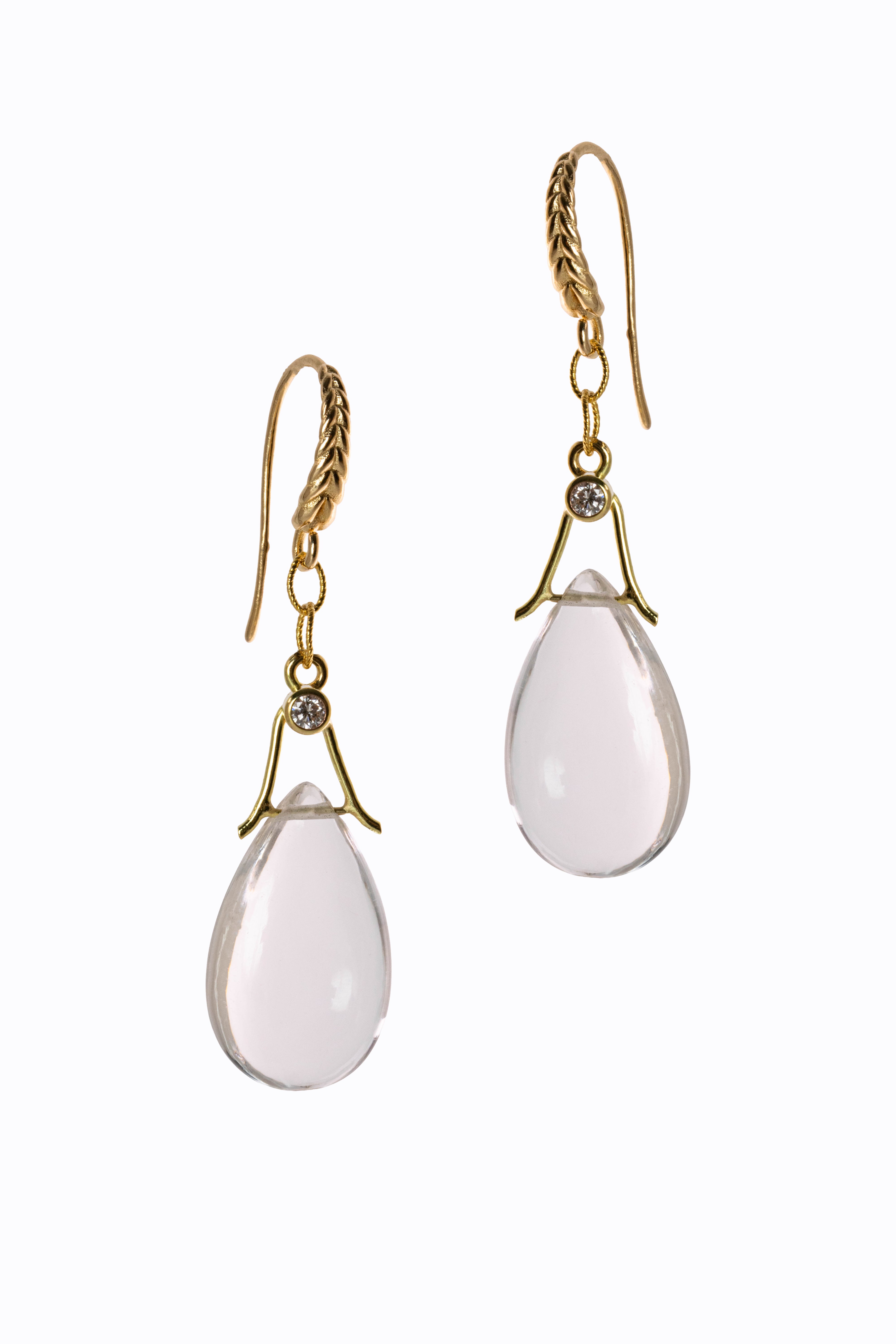 Natural rock crystal smooth briolette earrings with bezel-set diamond accents in 18k & 14k yellow gold on braided French hooks.