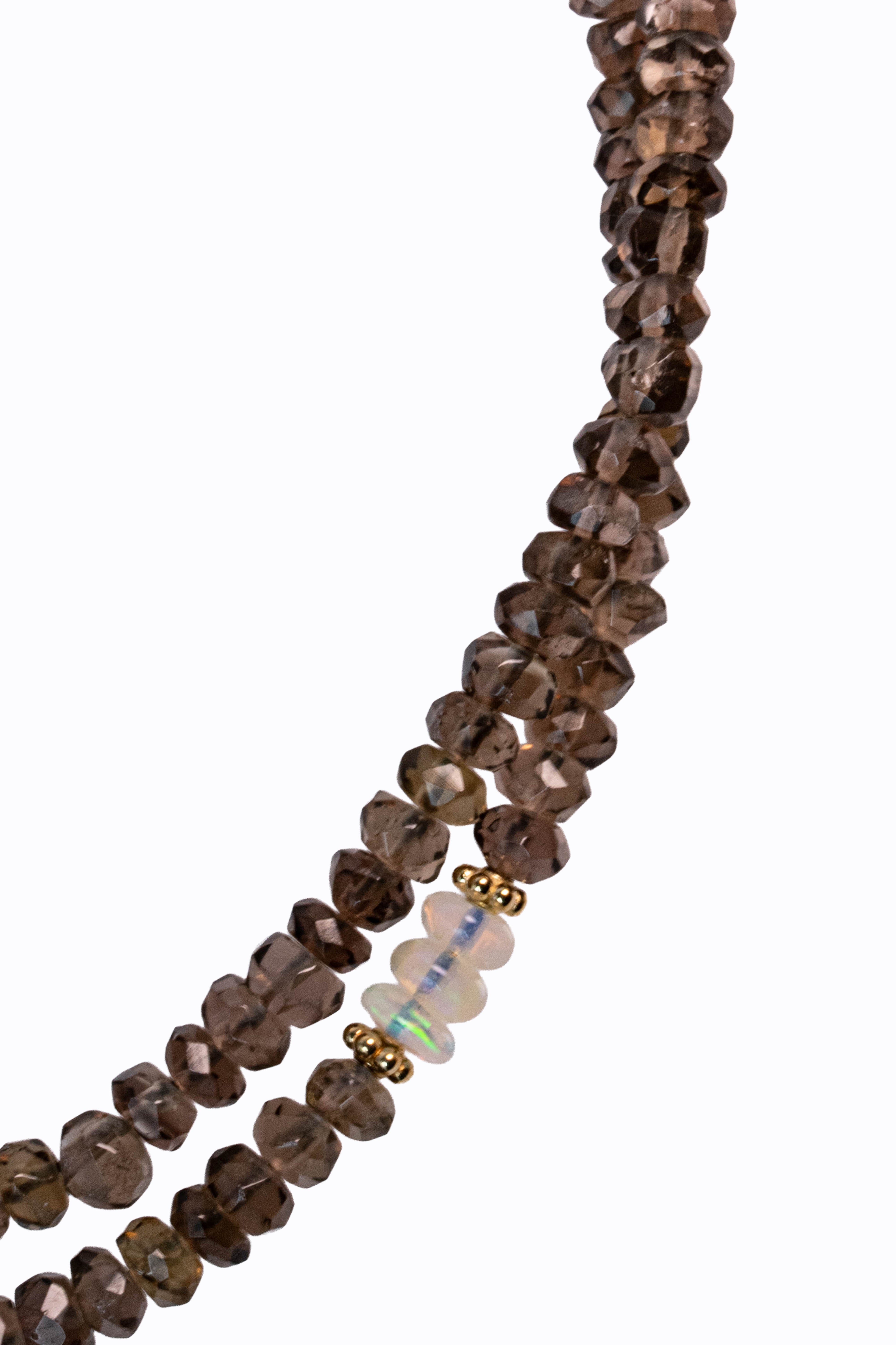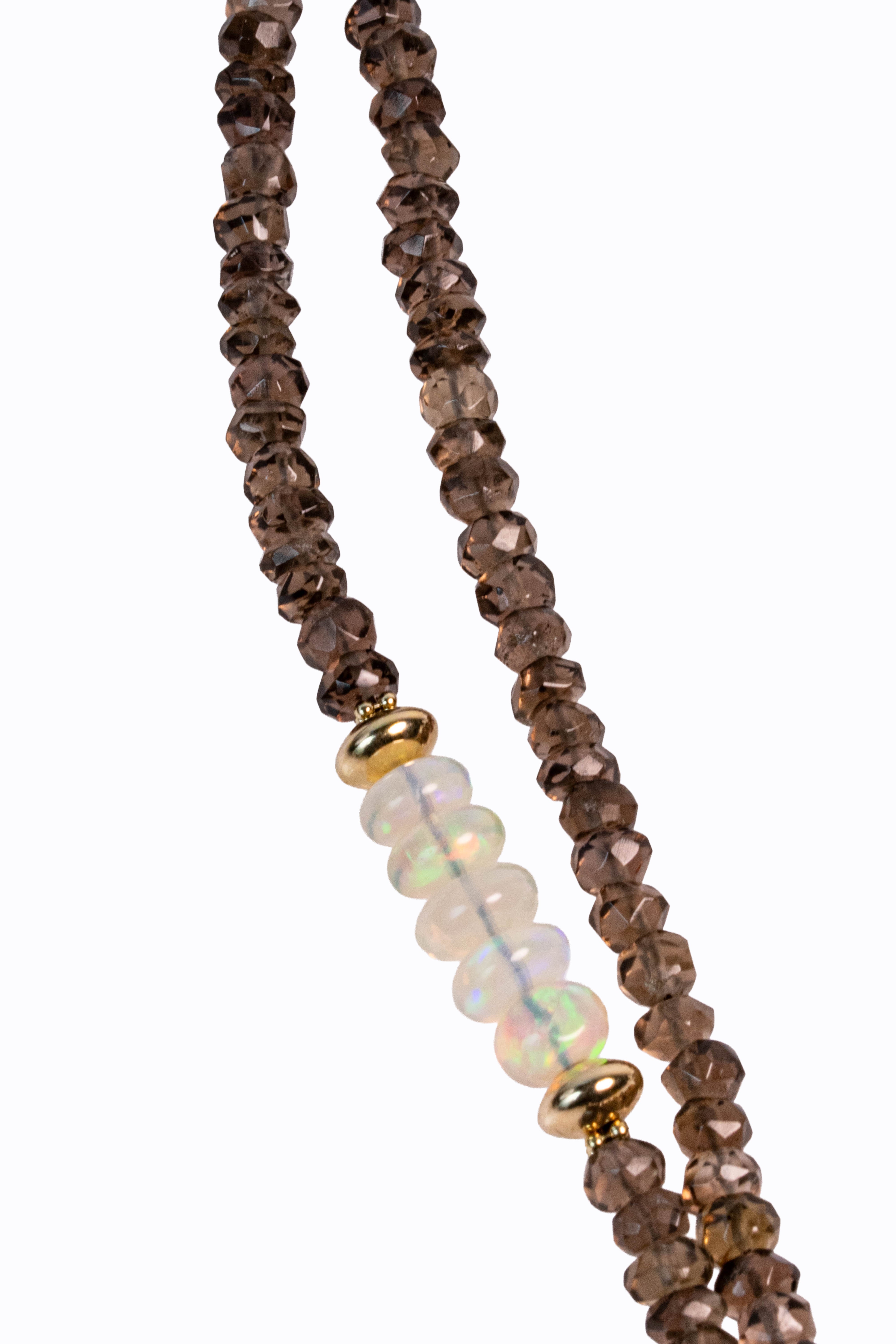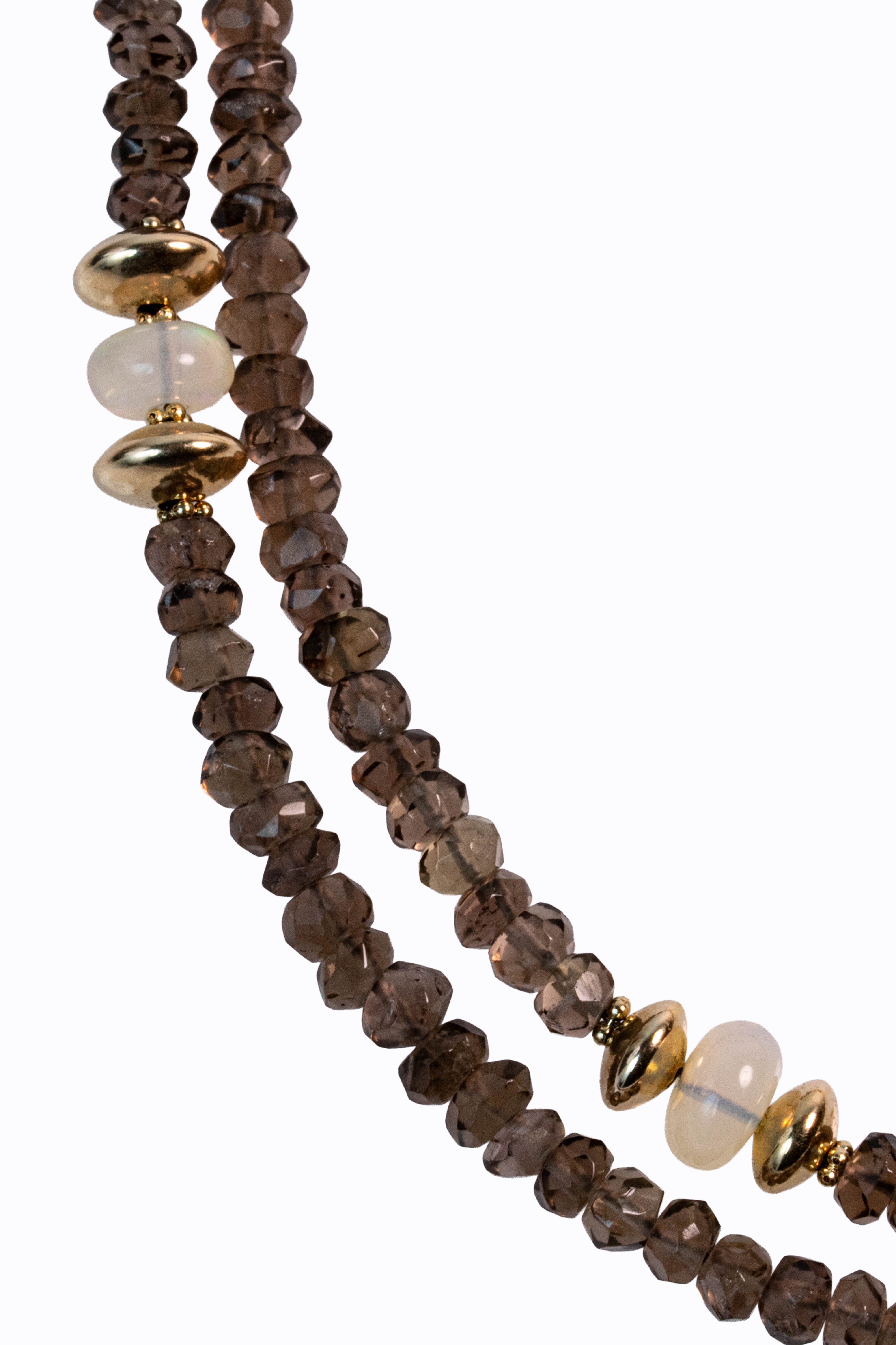 Smokey quartz faceted long rondelle necklace with Ethiopian opal accents, carved grey moonstones & 14k yellow gold.