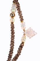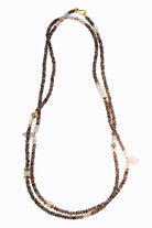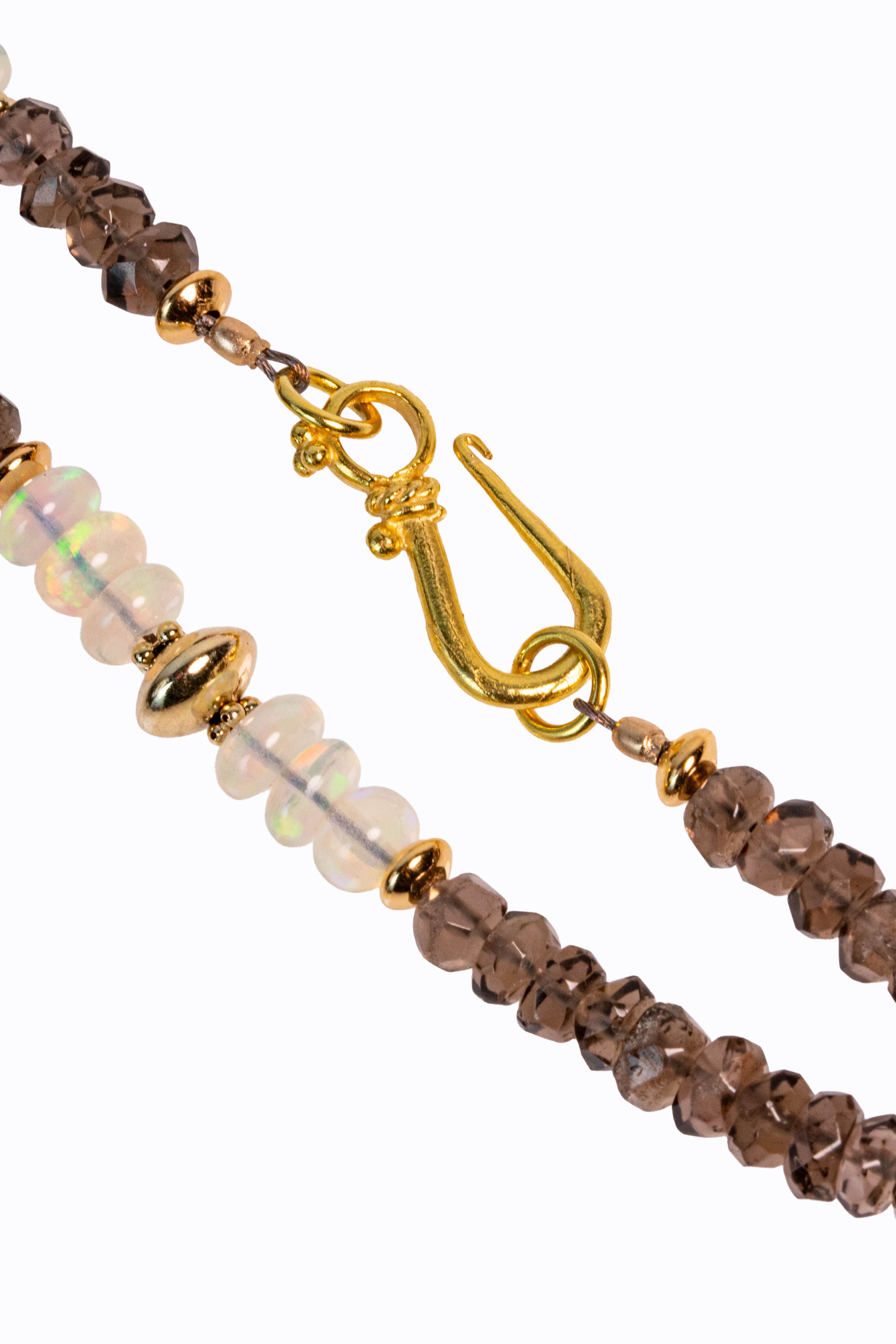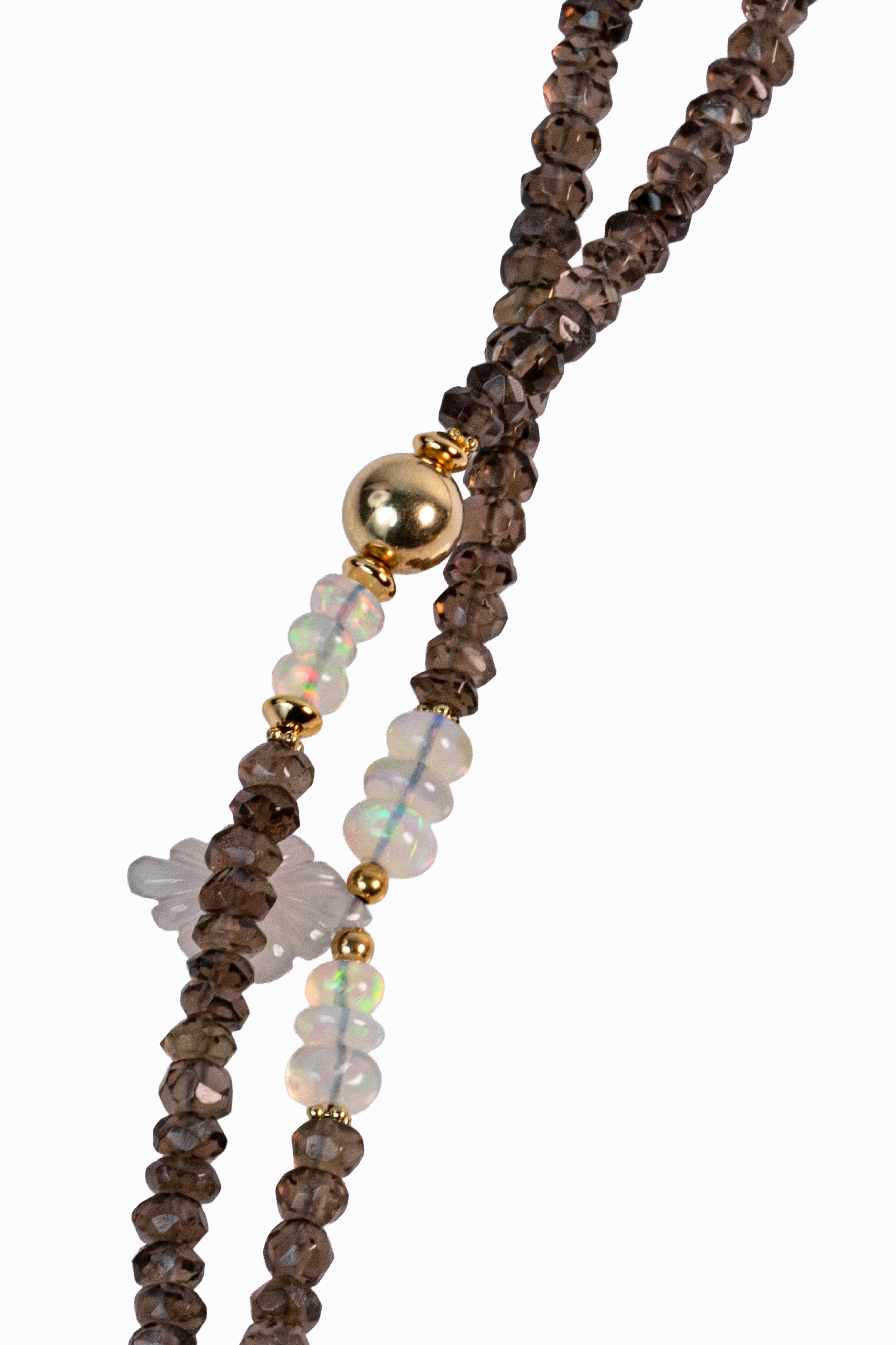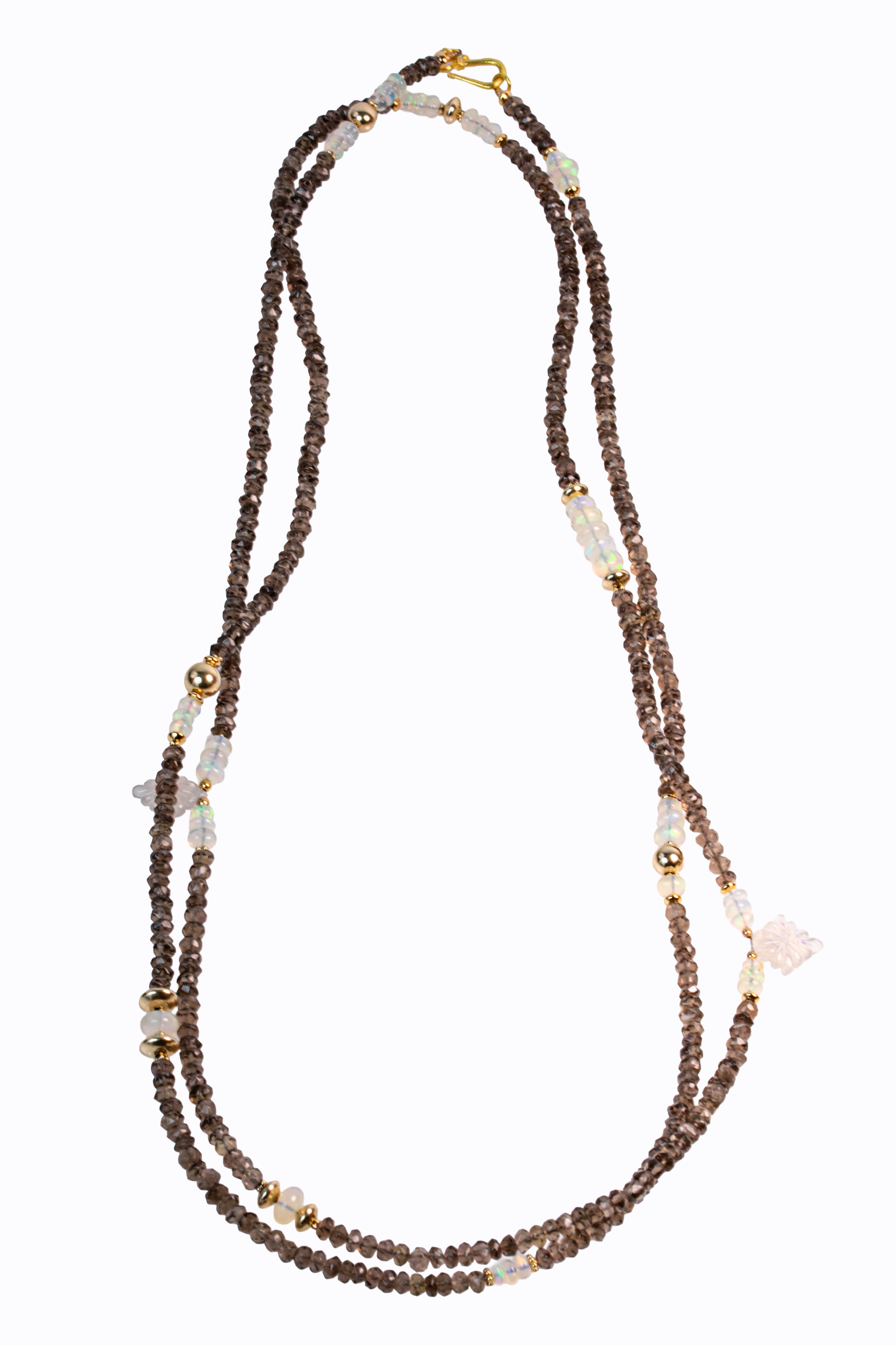 Smokey quartz faceted long rondelle necklace with Ethiopian opal accents, carved grey moonstones & 14k yellow gold.