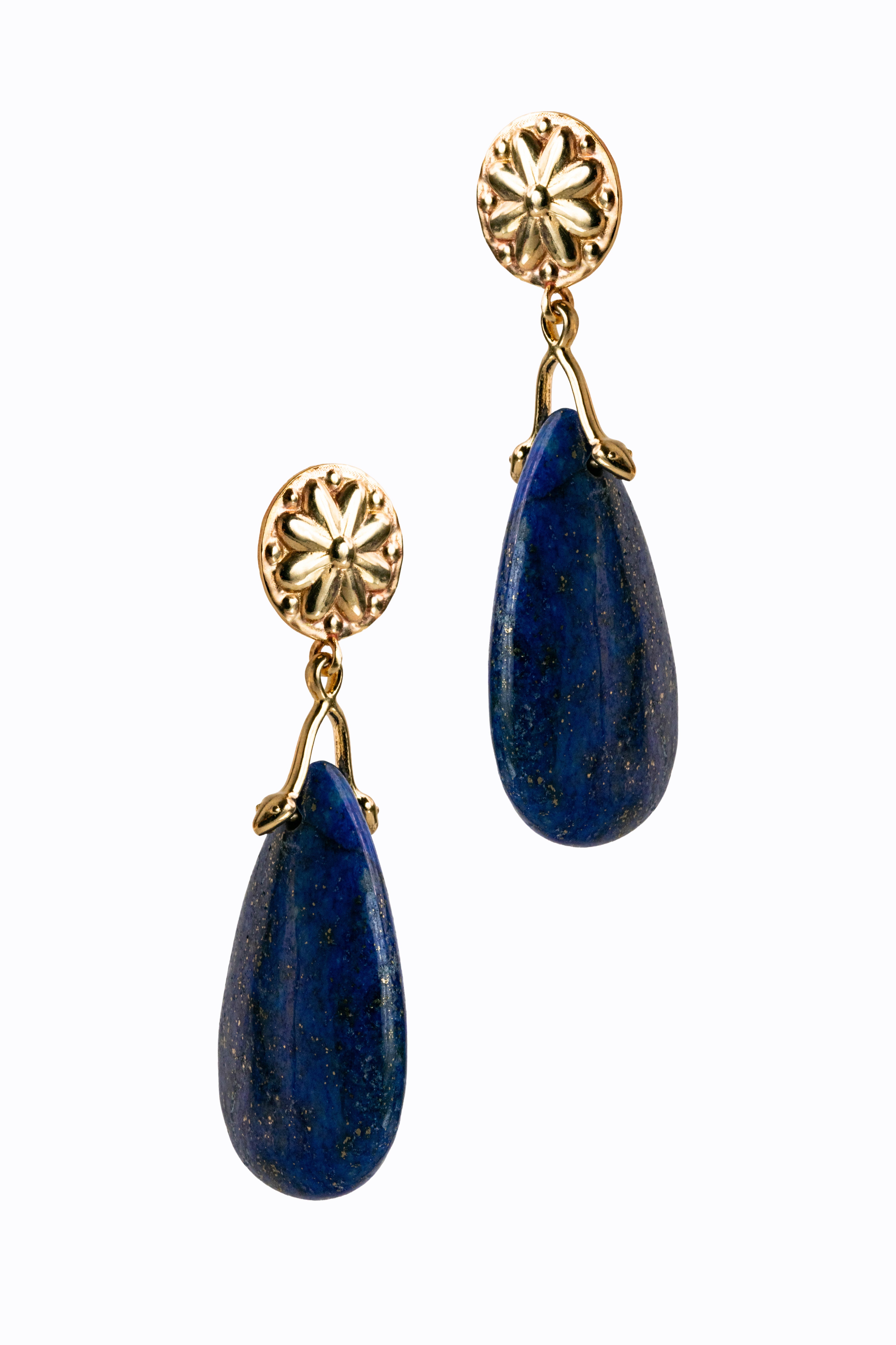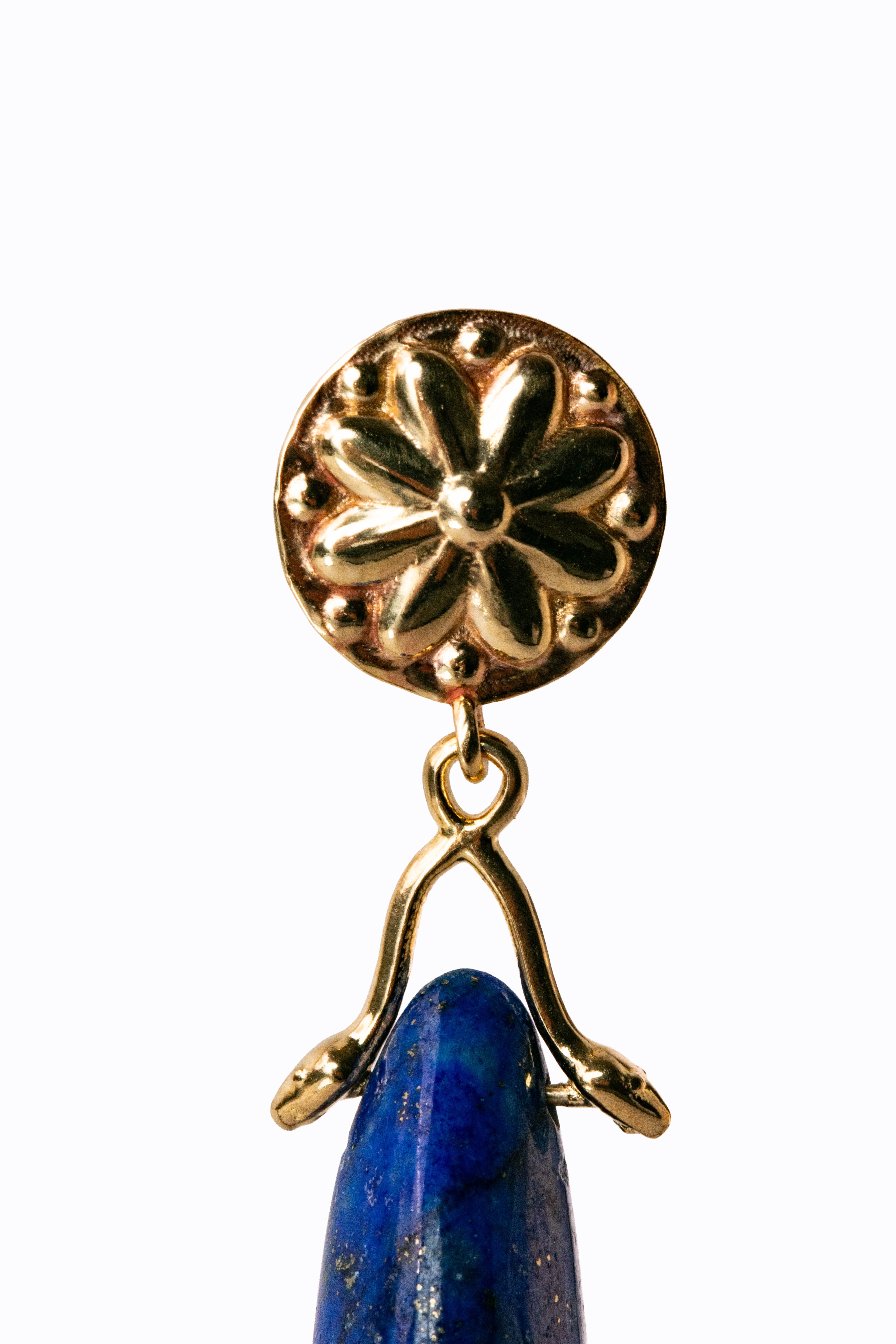 Lapis lazuli smooth briolette earrings with 14k yellow gold Snakie pinch bails & Fleur studs.