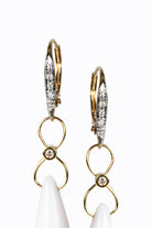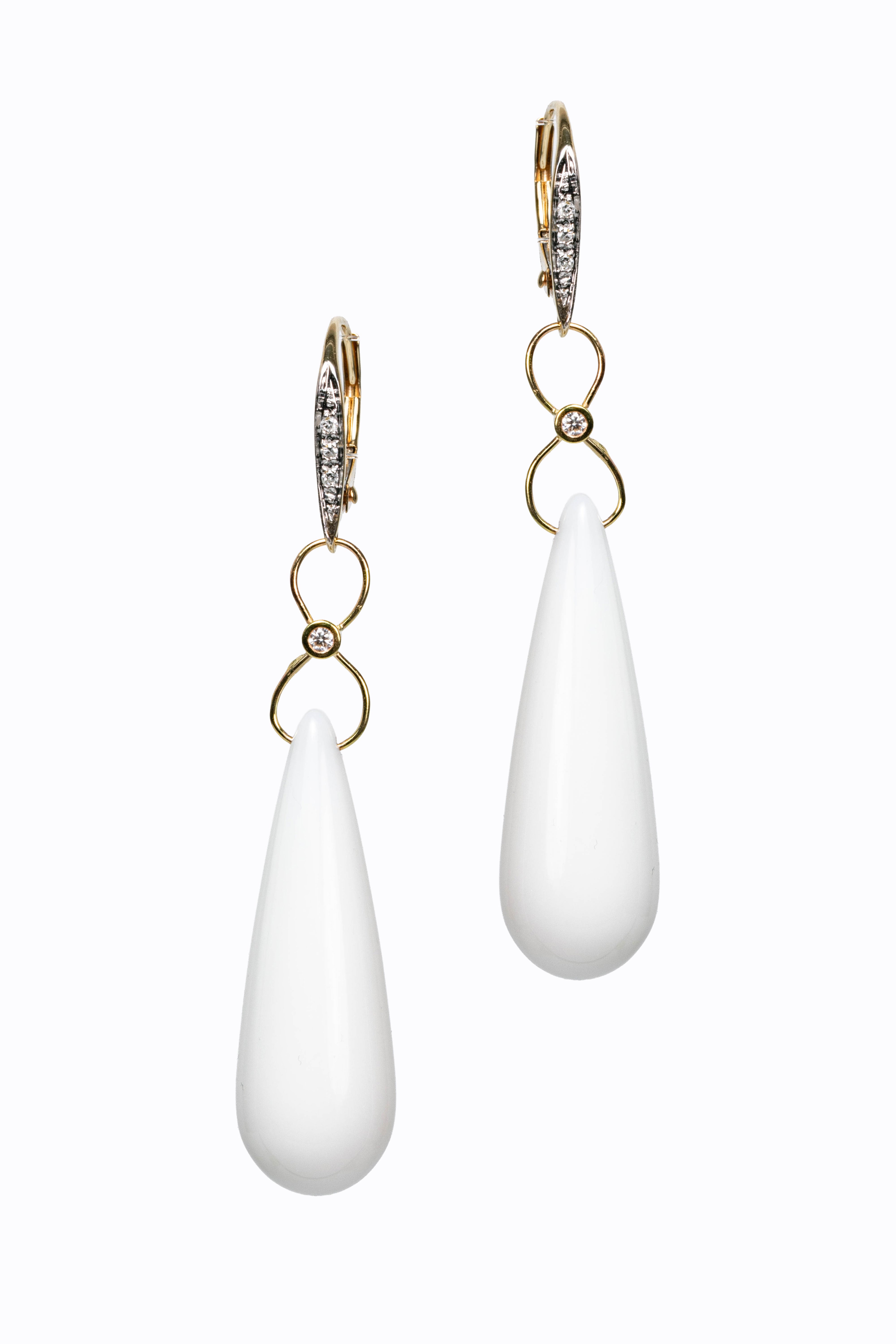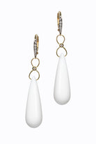 White agate smooth briolette earrings with 14k yellow gold diamond leverbacks & diamond accents.