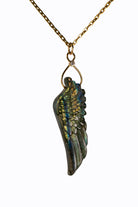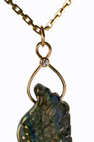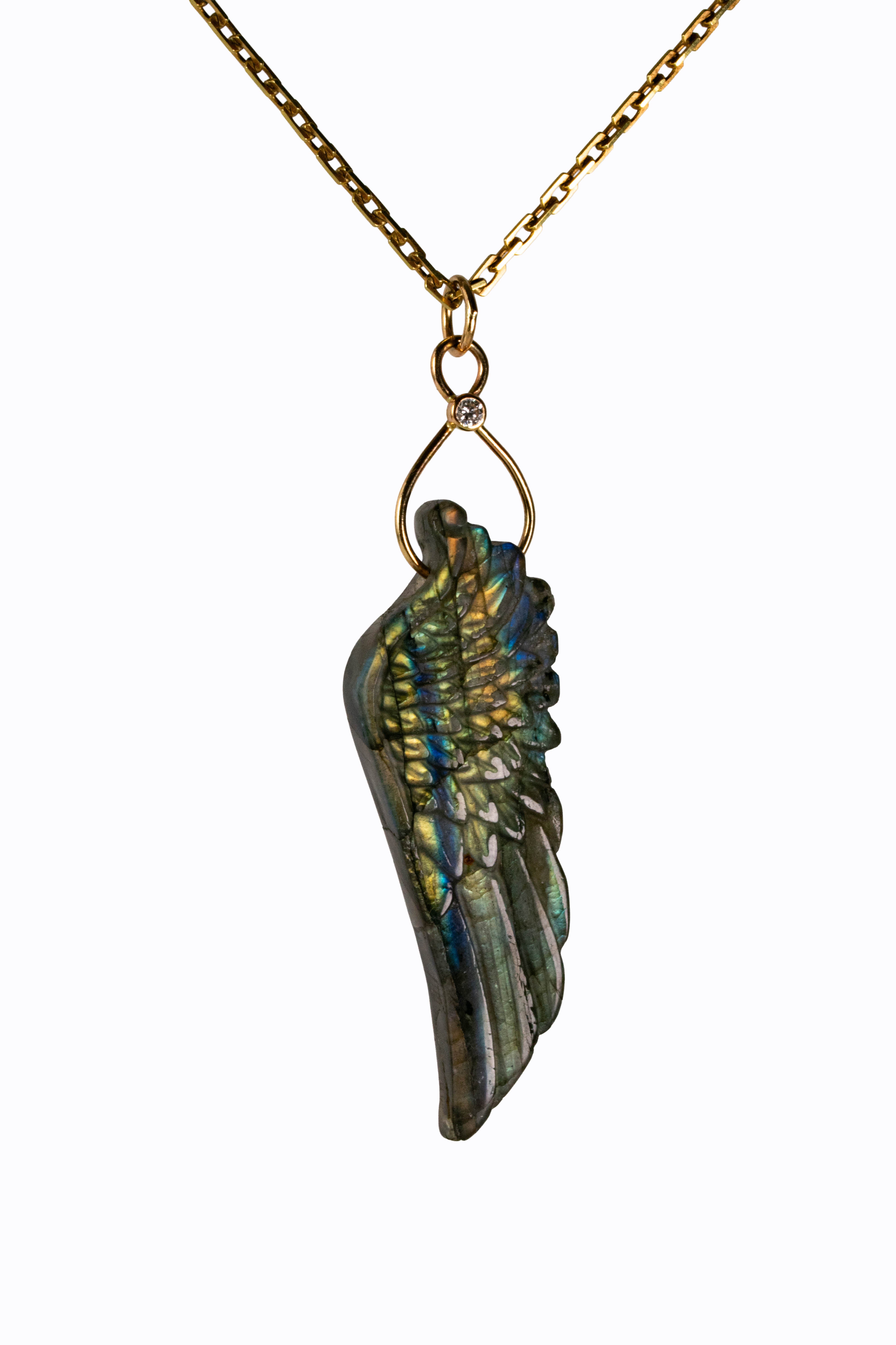 Beautifully carved labradorite wing pendant with 14k yellow gold, diamond accent. Shown on a mariner's link chain, available separately.