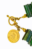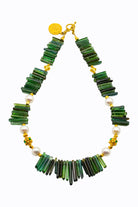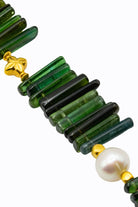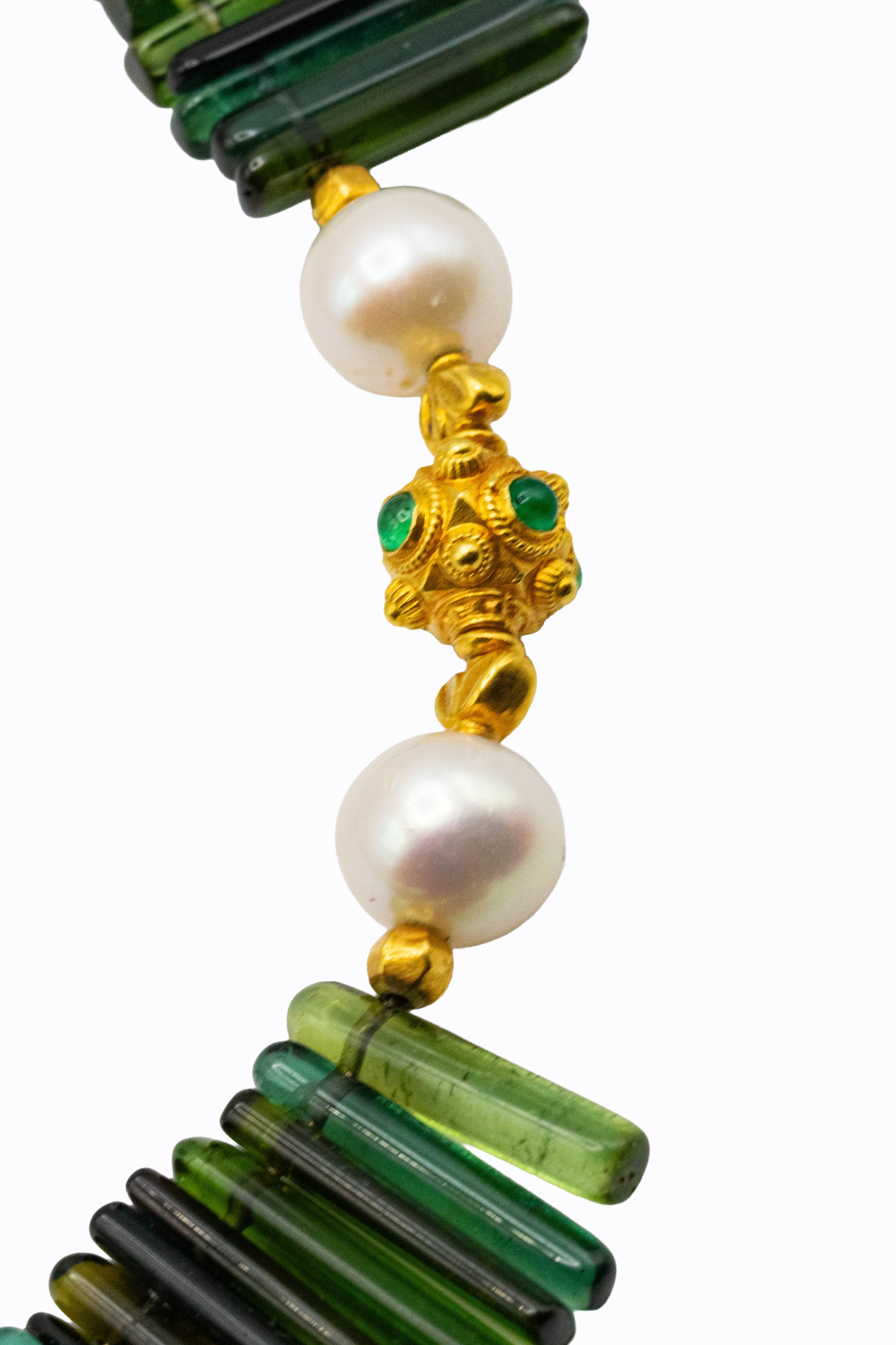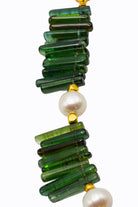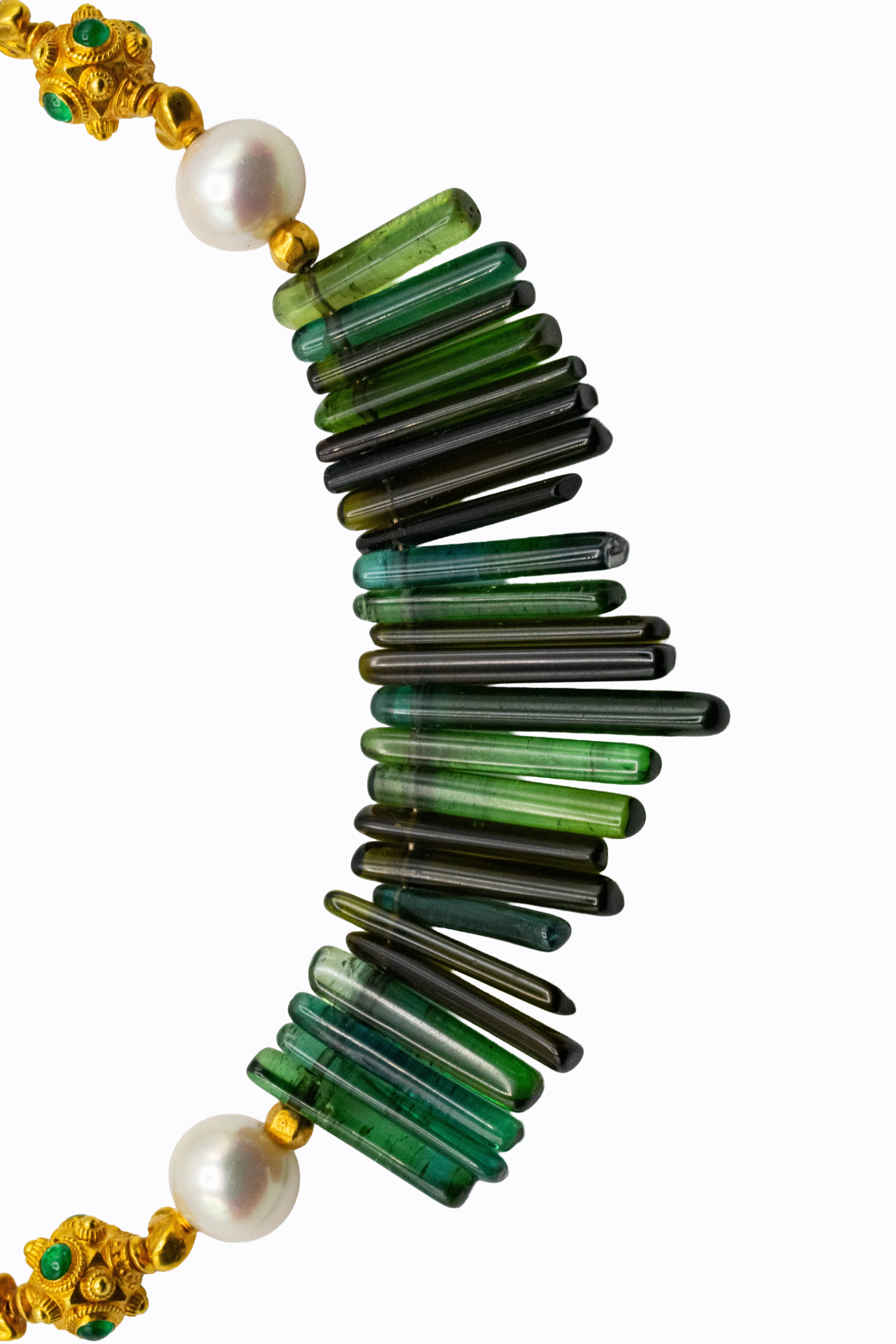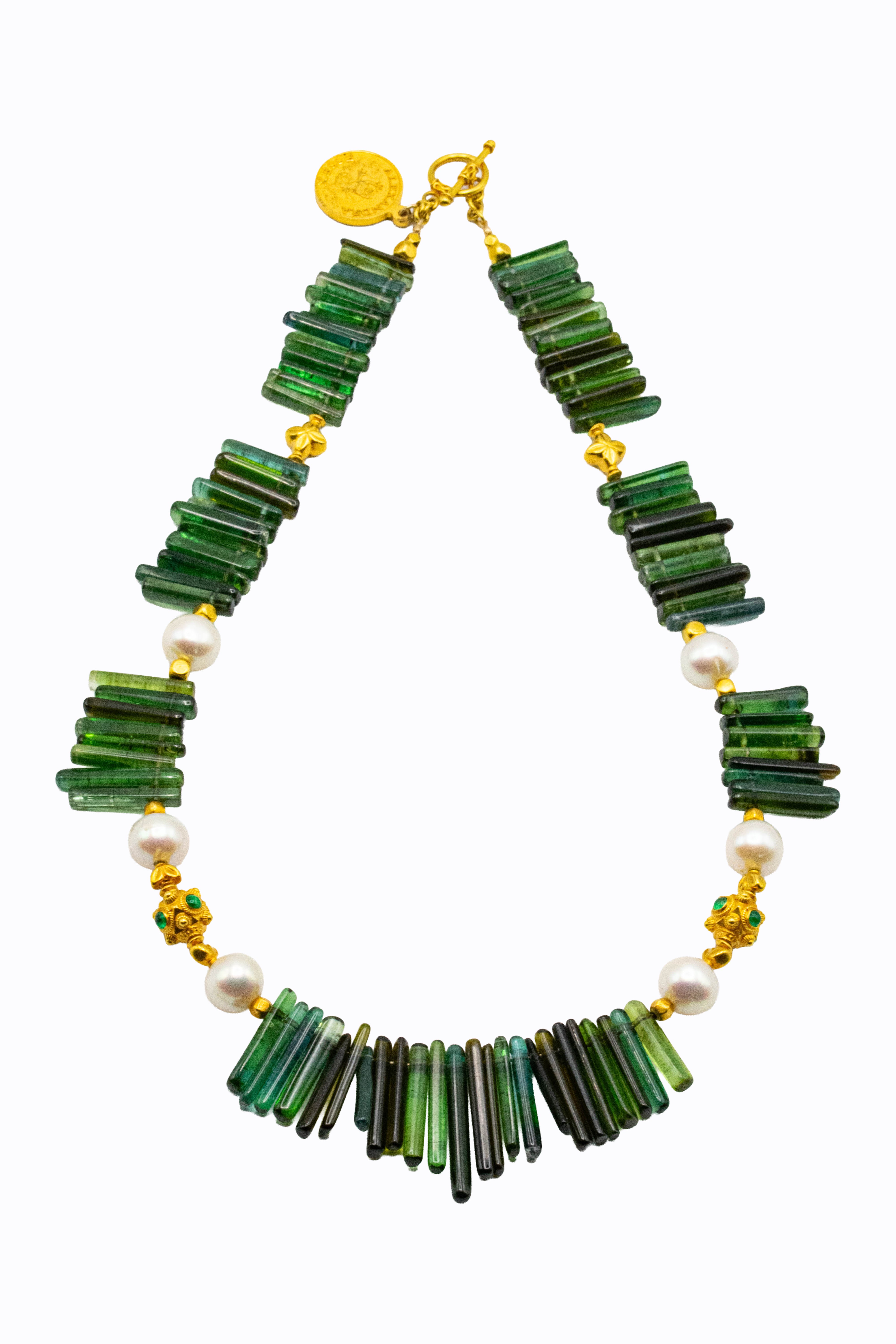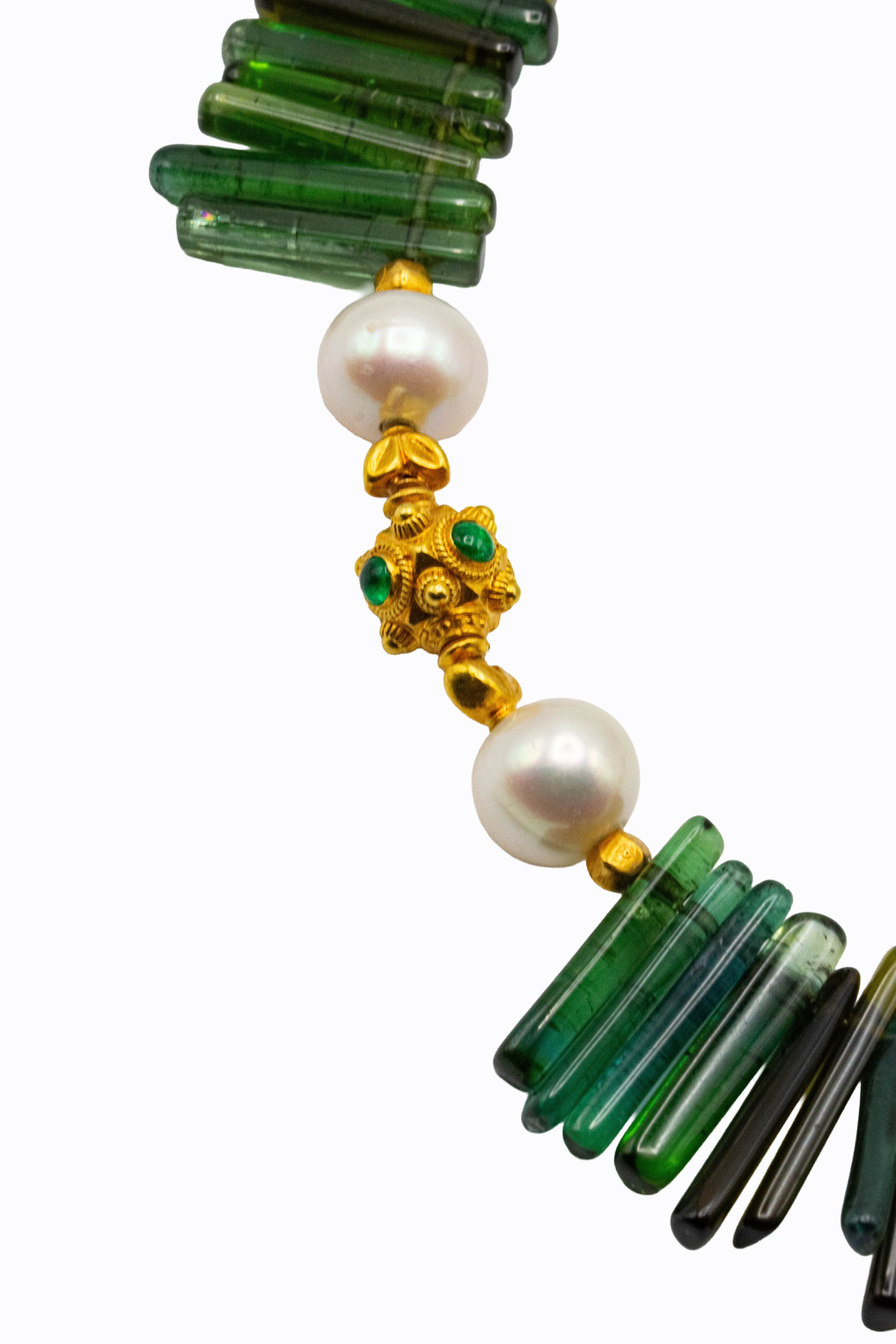 Japanese green stick tourmaline necklace with pearls, emeralds, and 18k yellow gold.
