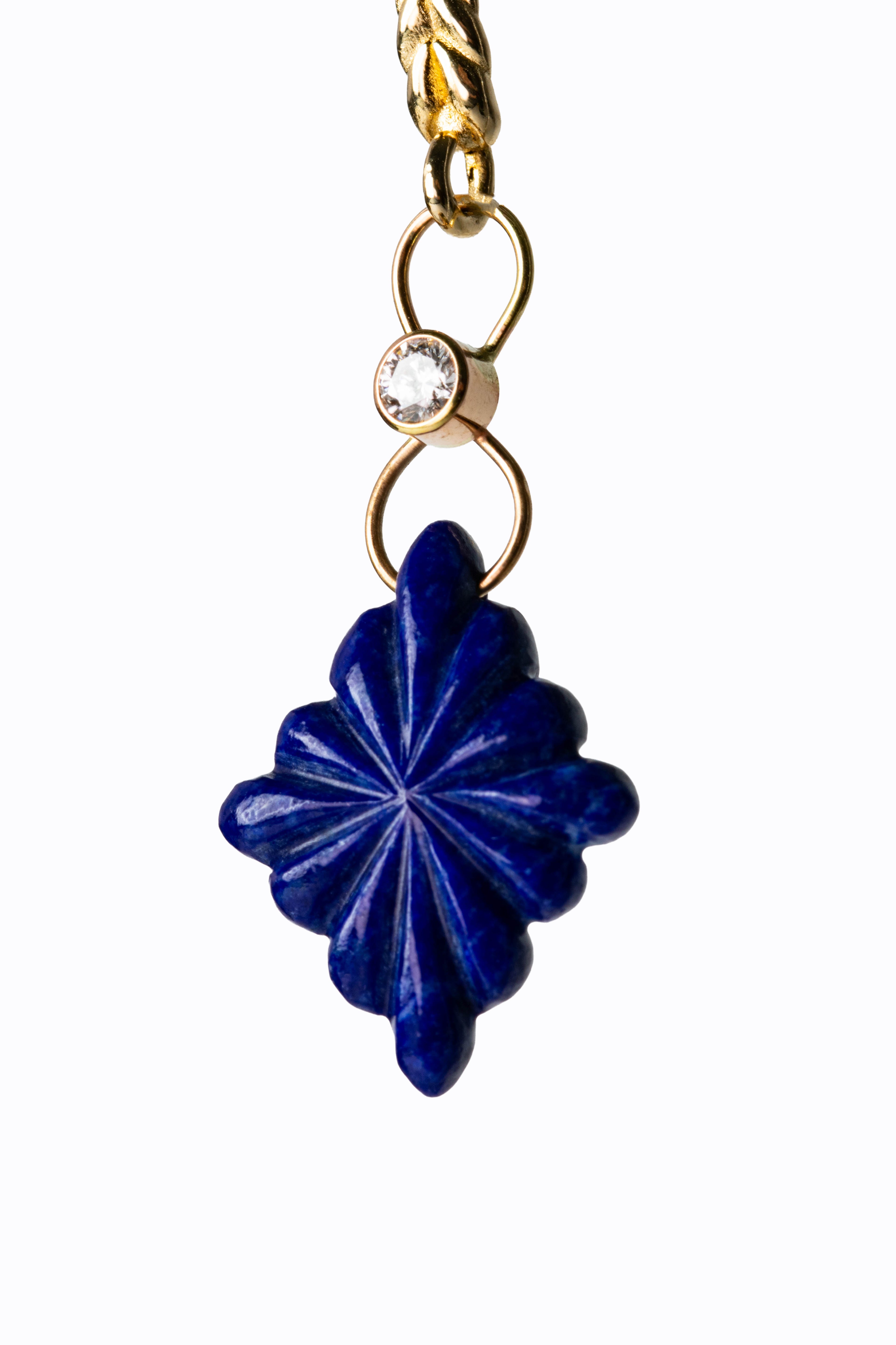 Carved lapis lazuli earrings with 14k braided French hooks & diamond accents