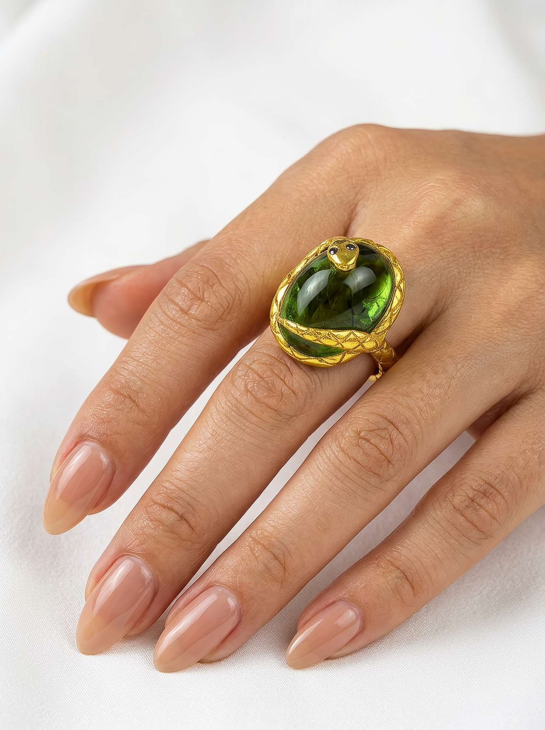 A serpent coils in 18k gold, wrapping protectively around a deep green tourmaline—