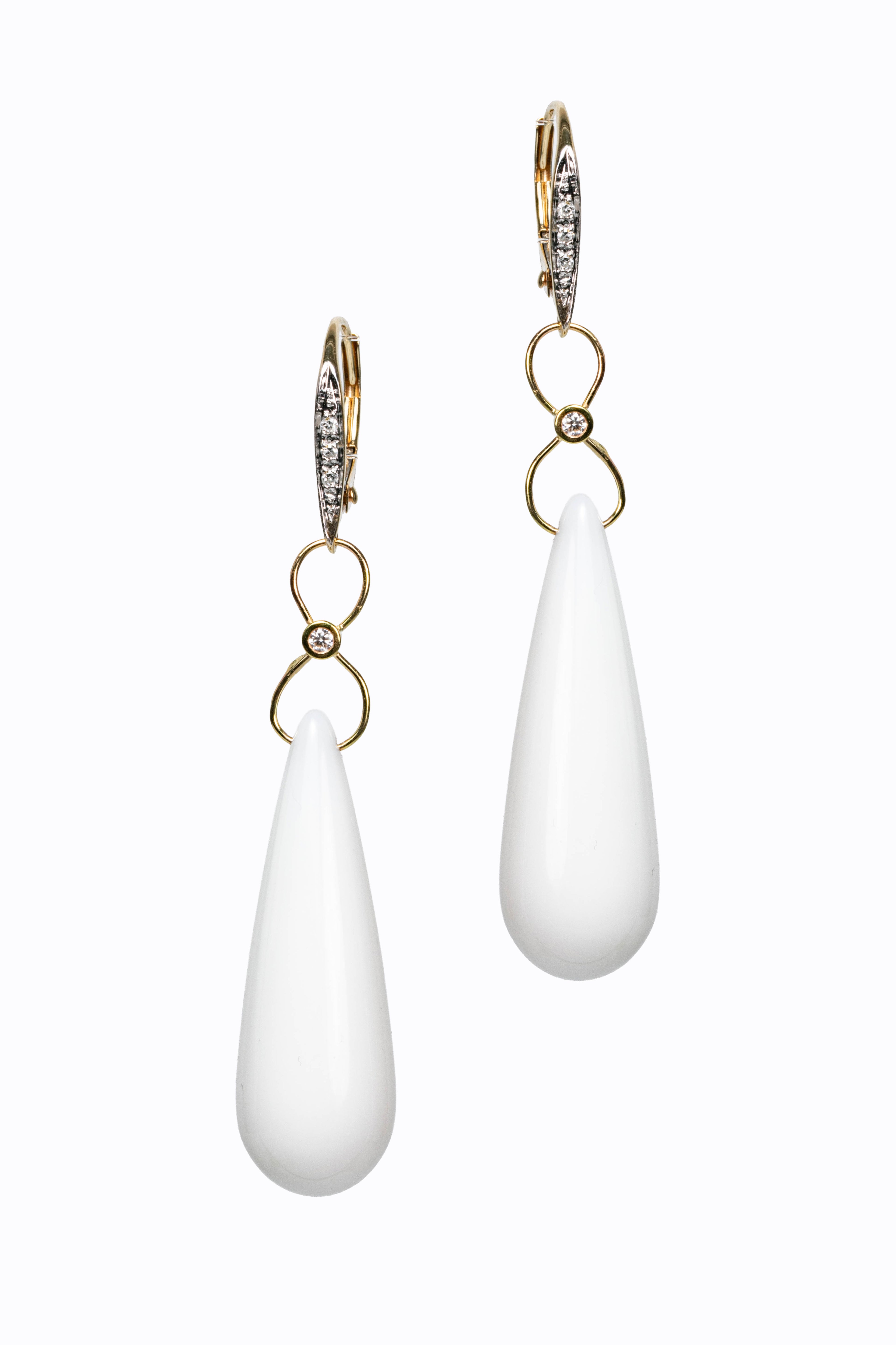 White agate smooth briolette earrings with 14k yellow gold diamond leverbacks & diamond accents.