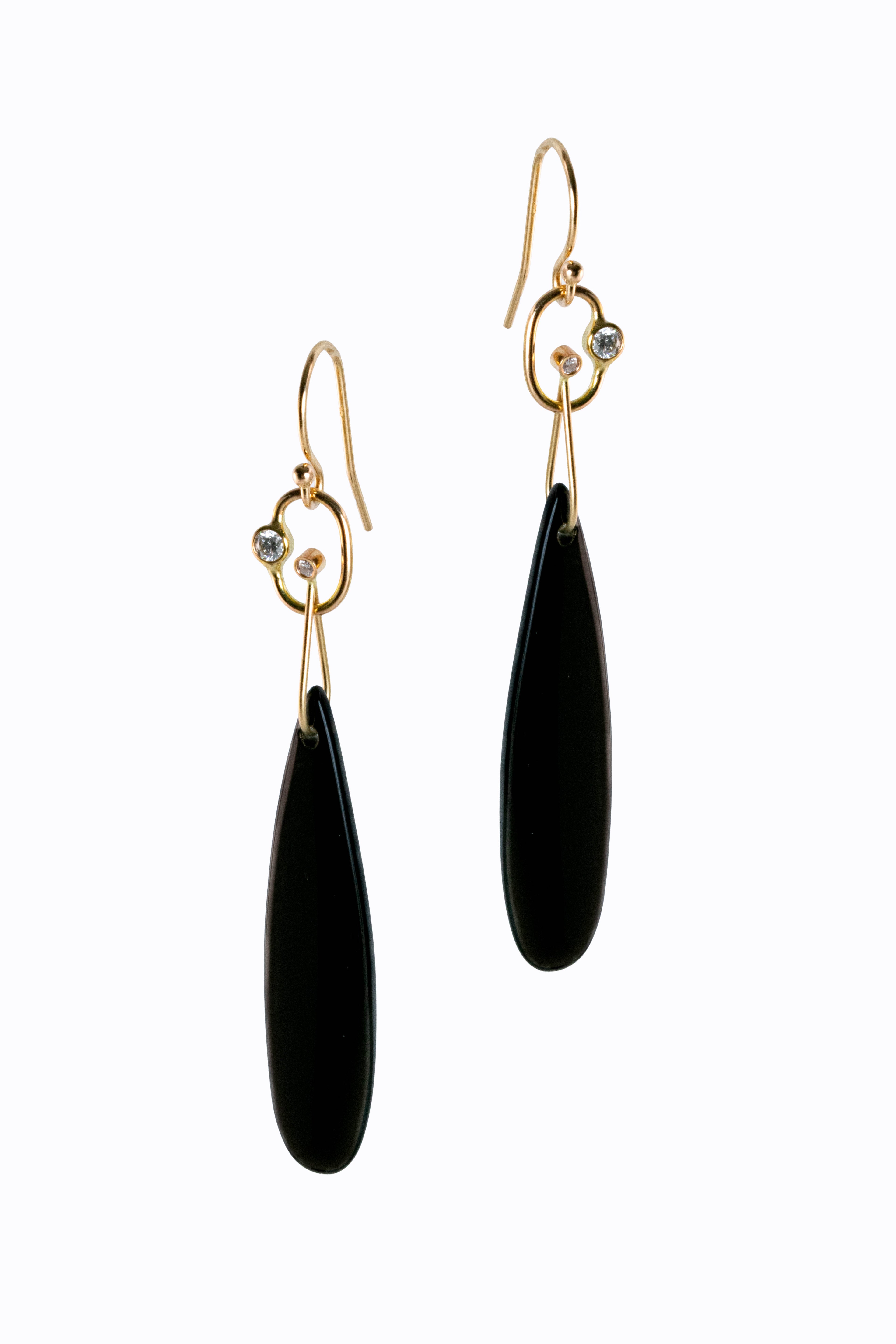 Gatsby black obsidian & 14k yellow gold french hook earrings with bezel-set diamond accents. Superbly elegant.