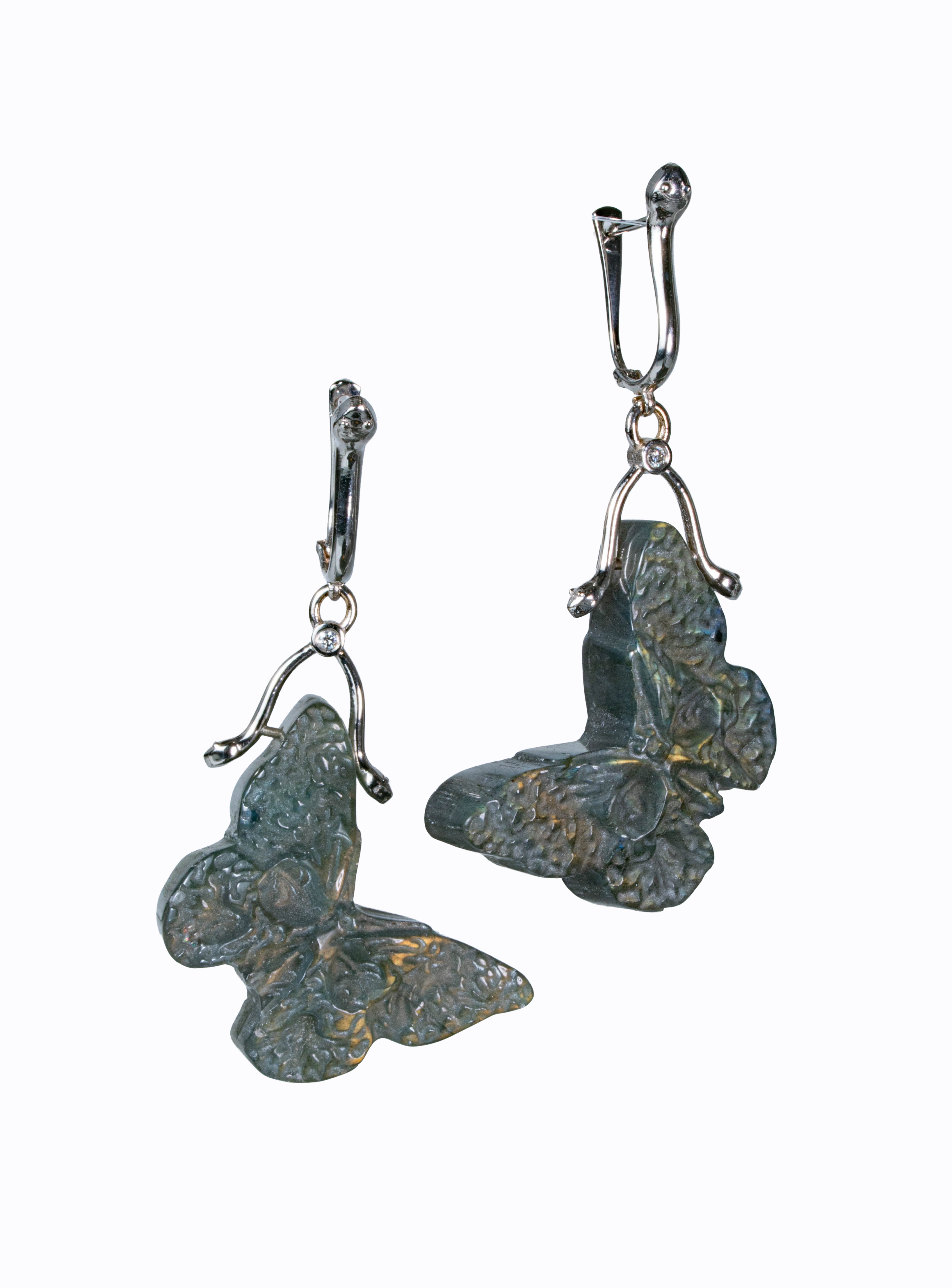 Papillon earrings with carved labradorite and 14k white gold Snakie leverbacks with diamond accents.