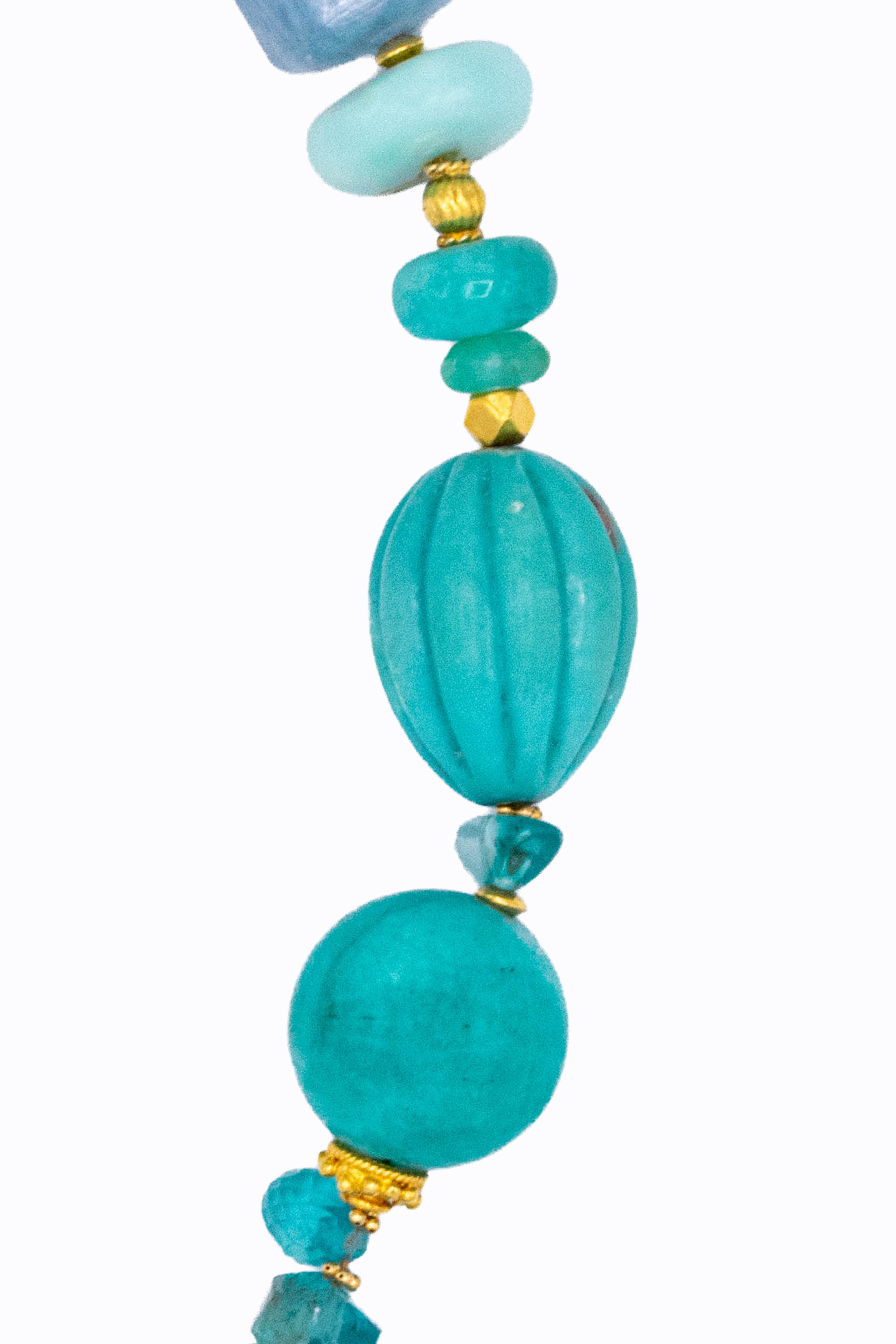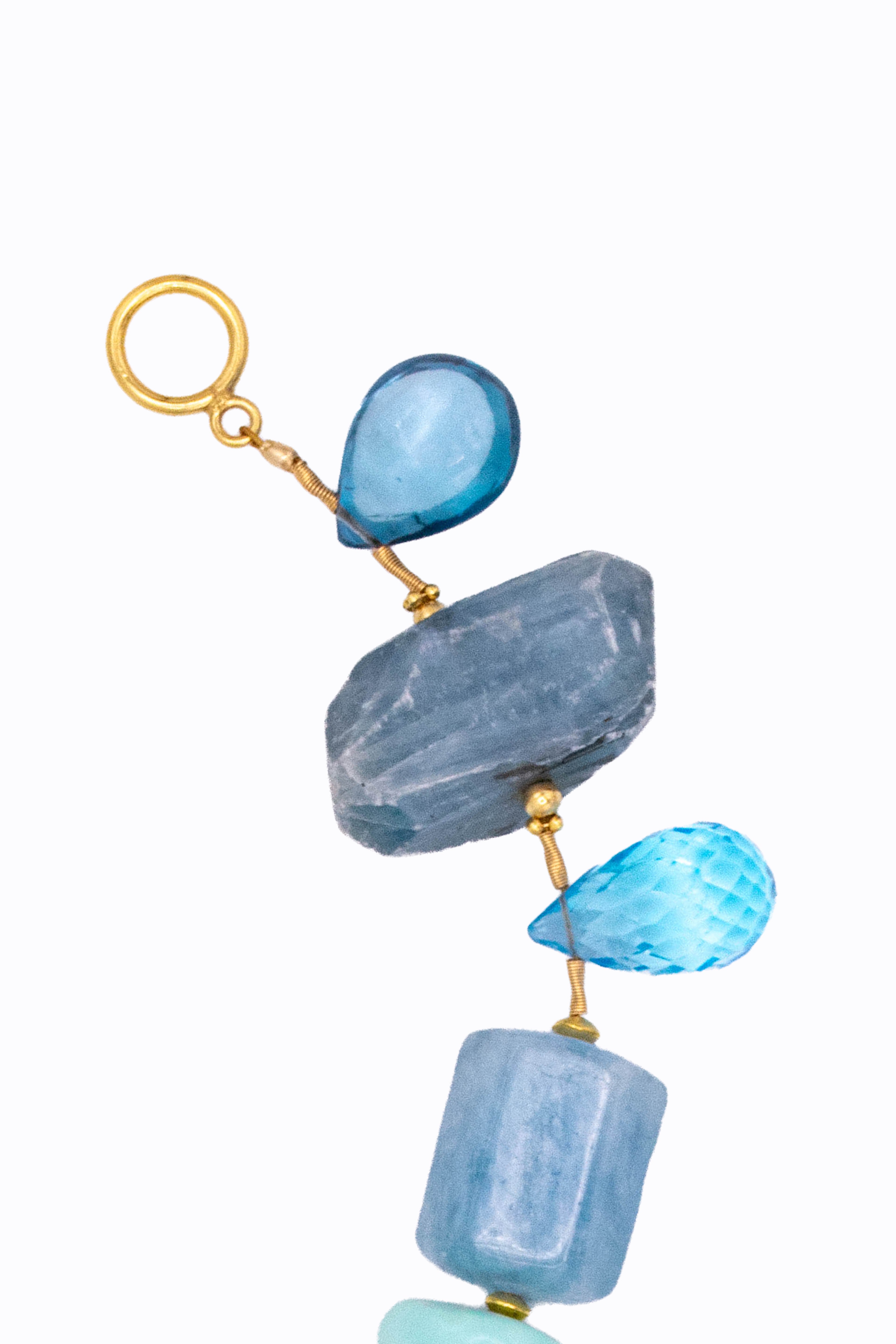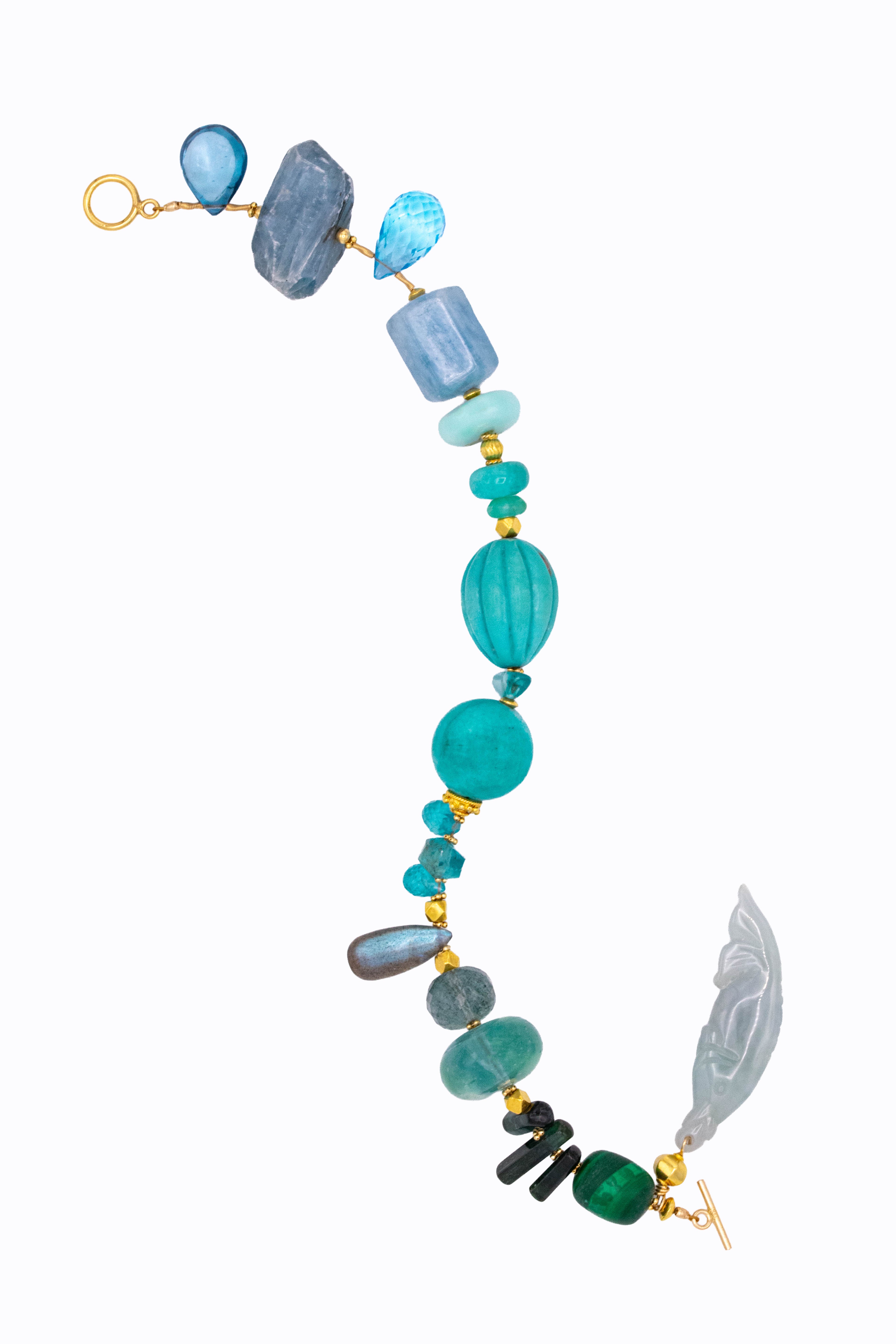 Bluey bracelet of topaz, labradorite, aquamarine, blue opal, apatite, turquoise, amazonite, fluorite, tourmaline, malachite and nephrite in 14k & 18k yellow gold. Toggle clasp.
