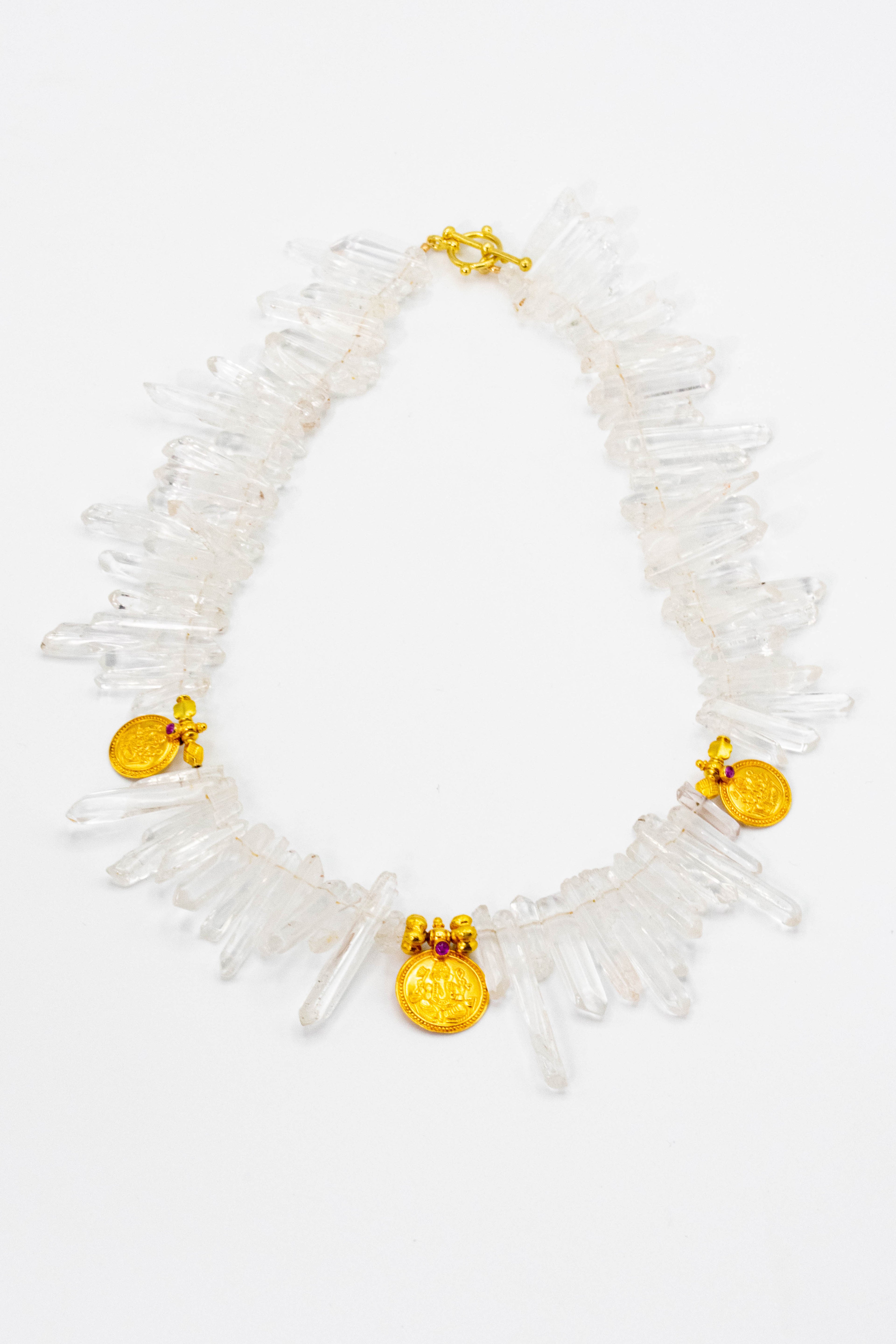 Tibetan white quartz necklace with 18k yellow gold Ganesh medallions & ruby cabochons. Toggle clasp.