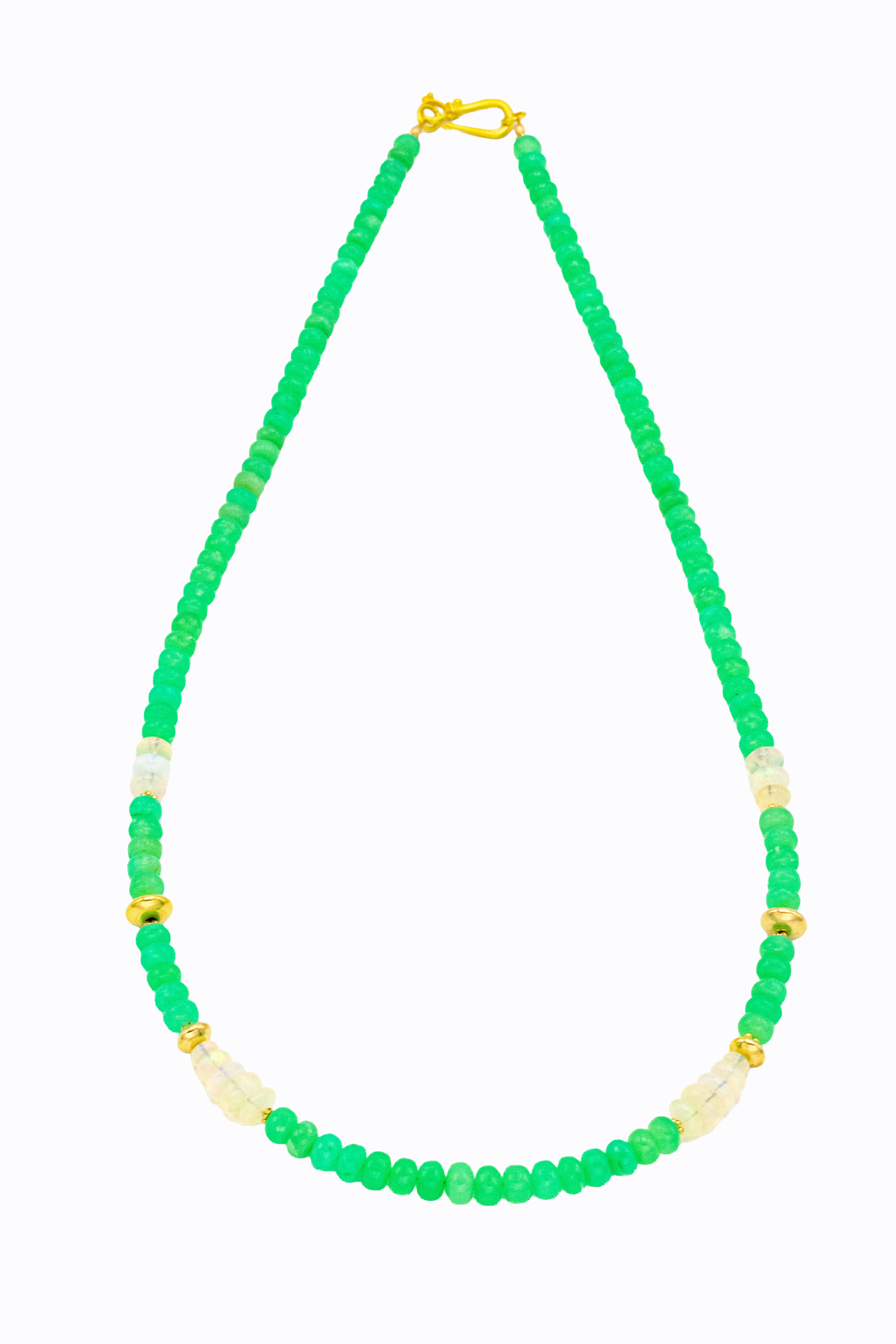 Australian chrysoprase rondelle necklace with Ethiopian opals & 14k yellow gold. Fish hook clasp. Fantastic, saturated, joyful color.