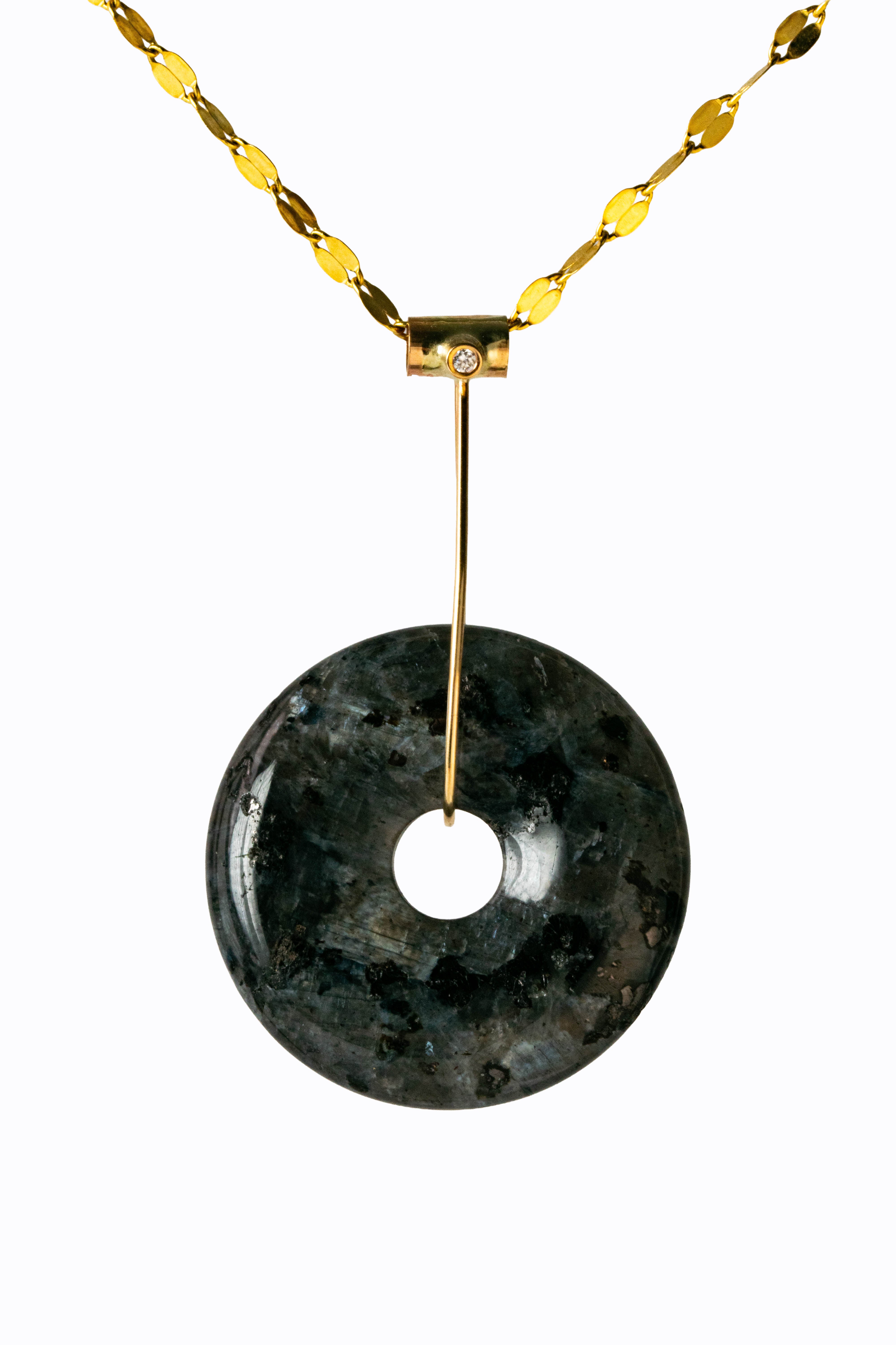 Norwegian Larvikite disc pendant with 14k yellow gold & white diamond accent