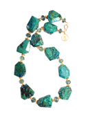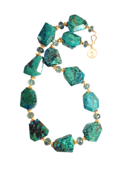 Rutilated aquamarine & chrysocolla necklace with 18k