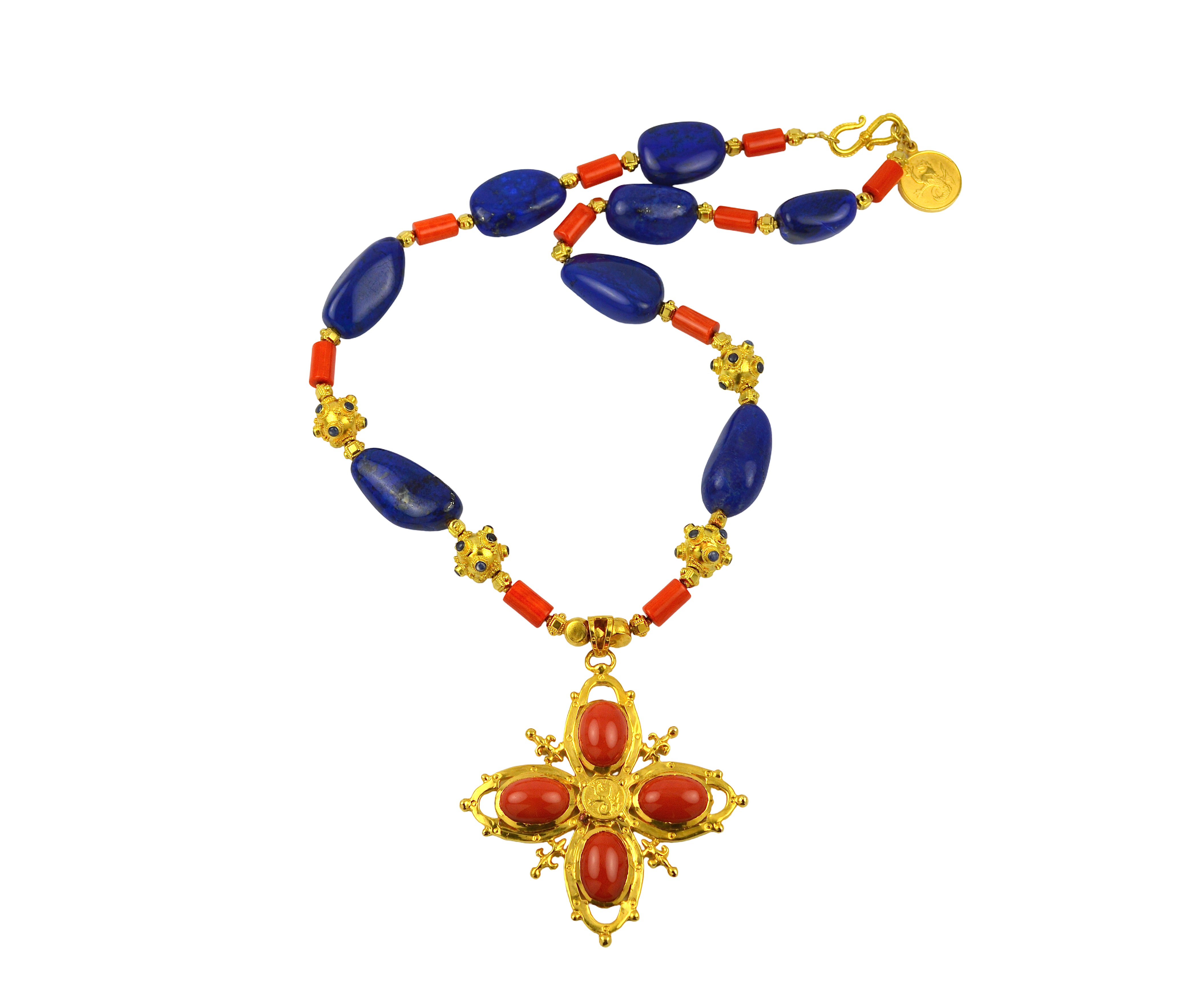 Coral & 18k cross with lapis, sapphire beads & 18k necklace