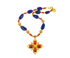 This exquisite necklace features an 18k gold cross adorned with vibrant coral, complemented by deep blue lapis and sparkling sapphire beads. Crafted with precision, it combines rich colors and precious materials to create a sophisticated piece that enhances any ensemble with timeless elegance and expert craftsmanship.