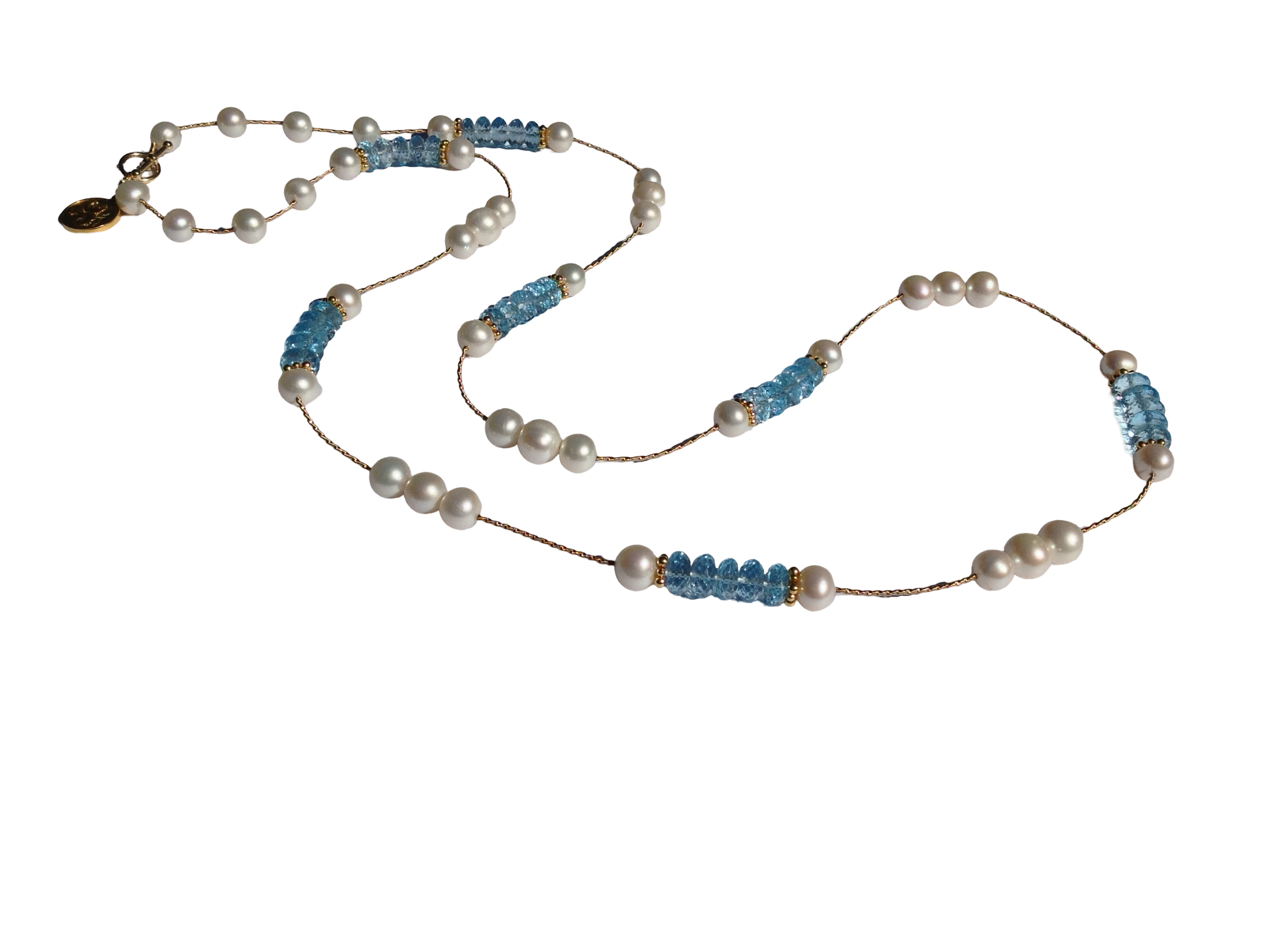 Long strand necklace w blue topaz rondelles, pearls, 18k & 14k