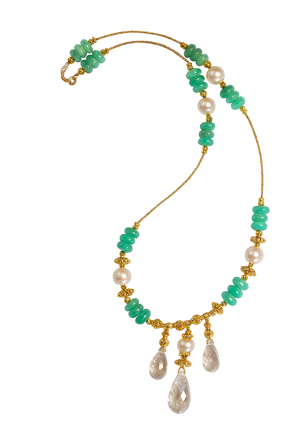 Peruvian opal smooth rondelle necklace w pearls, rutilated quartz faceted briolette 18k necklace