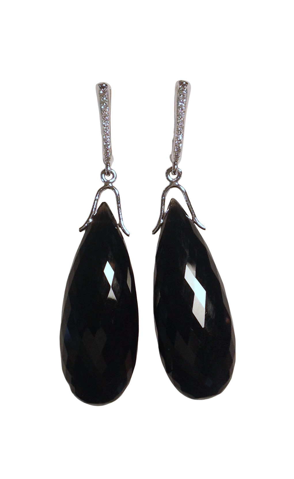 Faceted black onyx briolettes with 18k white gold diamond pave leverbacks